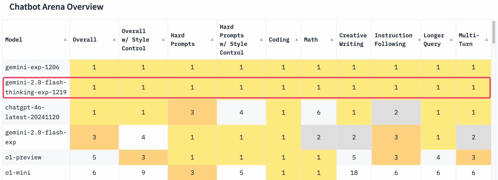 その性能は極めて高く、「Gemini 2.0 Flash Thinking」は、記事執筆現在、ユーザー投票による大規模言語モデルの性能ランキングサイト Chatbot Arena の全ジャンルで1位に君臨している。