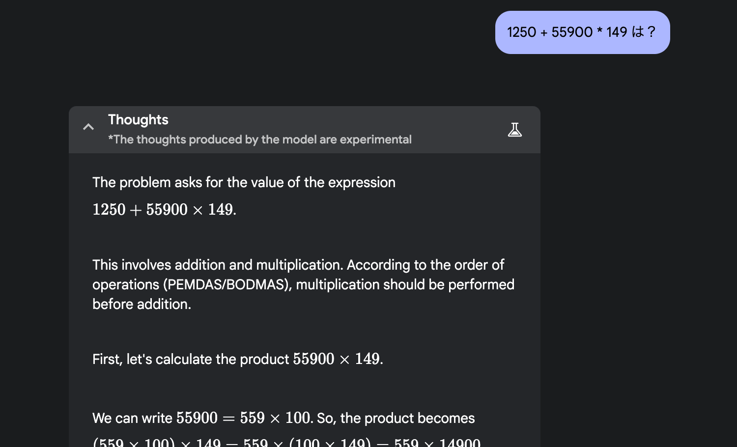 例えば、Gemini 2.0 Flash Thinking に適当な計算問題を聞いてみると、回答とは別に、「Thoughts」というレスポンスが得られ、思考過程が表示される。