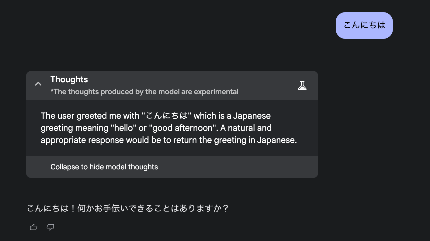 例えば、単に「こんにちは」と打ち込んでみただけだが、Geminiがユーザーからの「こんにちは」を受け取った後、それが日本語の挨拶であり、日本語の挨拶を返すのが適切である、という思考を行った流れを覗き見ることができる。