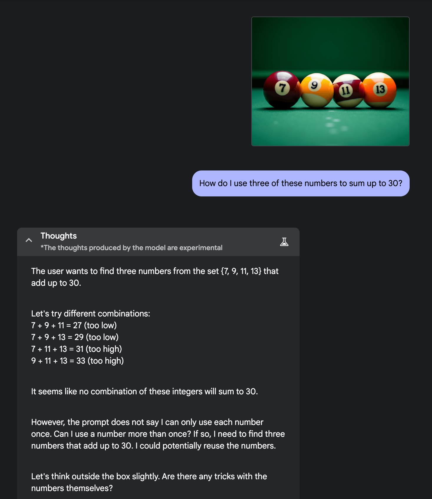 Geminiには、画像とともに、「How do I use three of these numbers to sum up to 30?(これらの数字を3つ使って合計を30にするには?)」というプロンプトを与える。すると、9秒間考えた末に、見事に正解を導いてくれた。