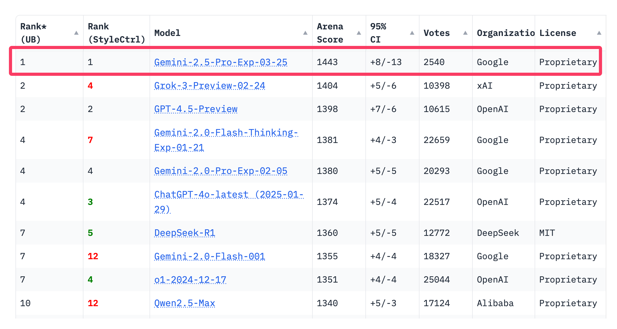 Gemini 2.5 Proは、人間による投票でAIモデルの性能を競うサイト「Chatbot Arena」でも、xAIのGrok-3や、OpenAIのGPT-4.5などの競合を抑えて世界トップに躍り出た。
