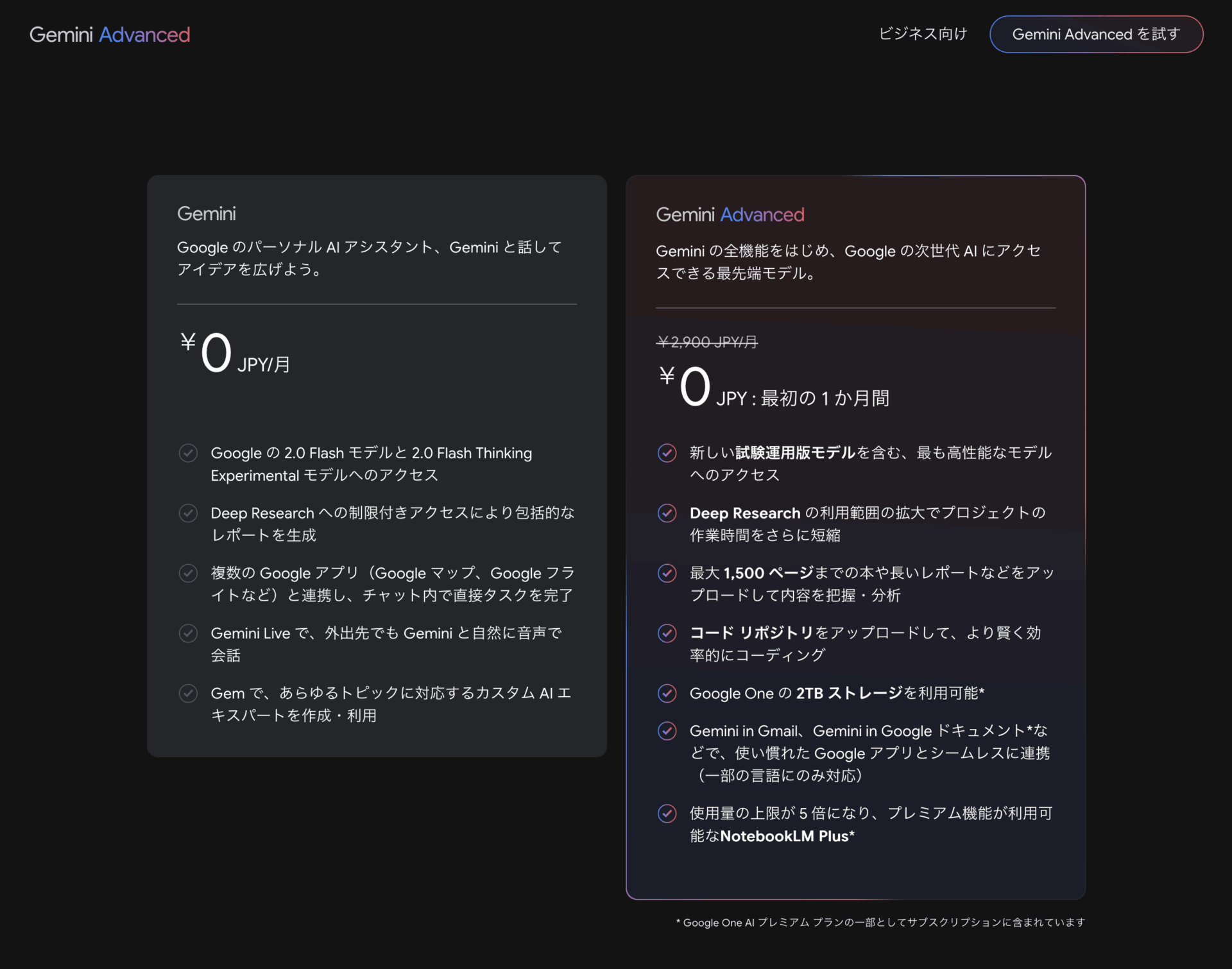 Gemini Advancedは、「Gemini 2.5 Pro Experimental」などの最新モデルを利用できることをはじめ、Googleドライブのストレージや、NotebookLMのプレミアム版が使えたりするので、コストパフォーマンスは悪くない。