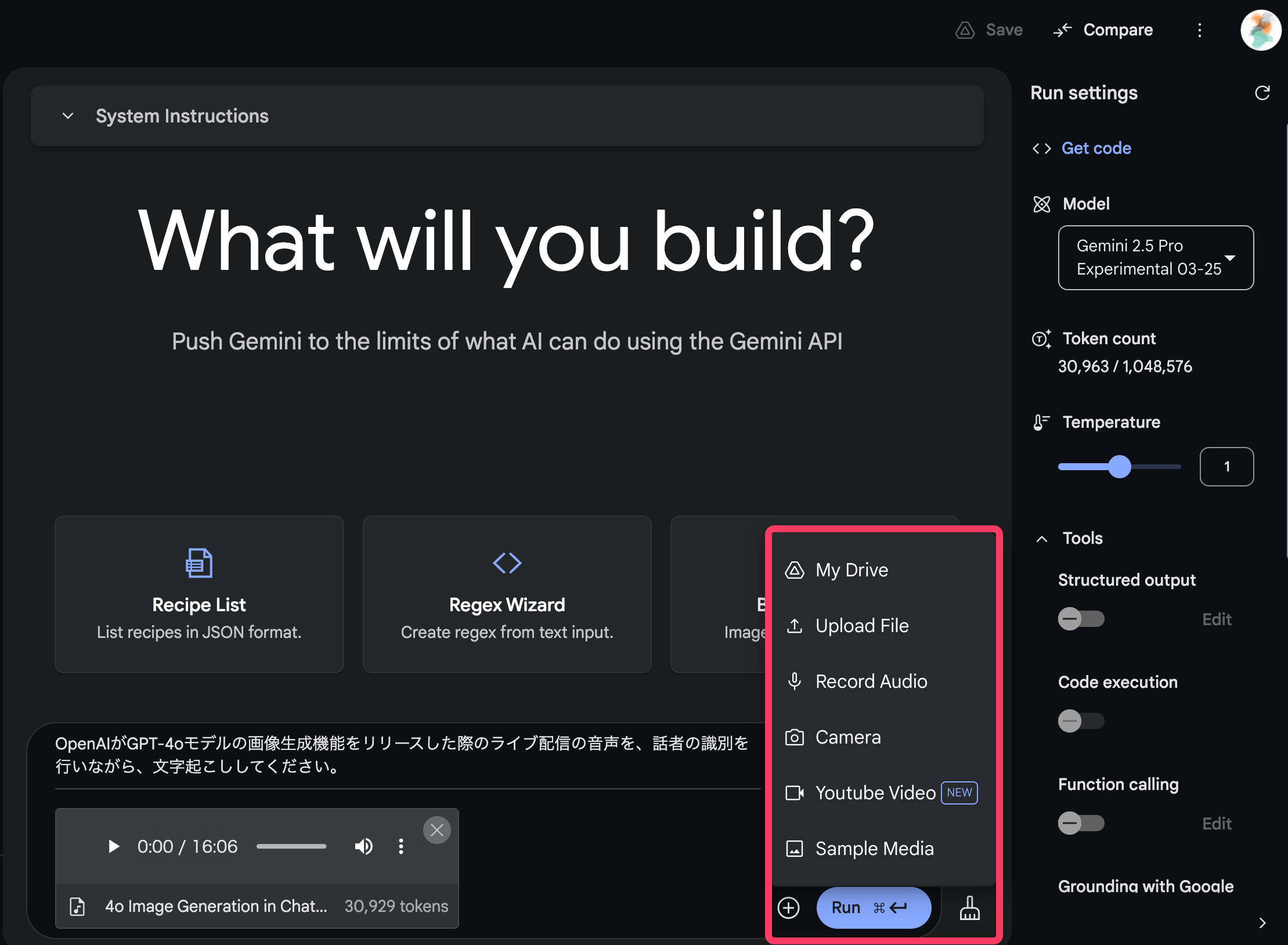 Geminiの音声読み取り機能を活かすと、WhisperやGPT-4o TranscribeのようなSpeech-to-Textモデルと似たような使い方ができる。
