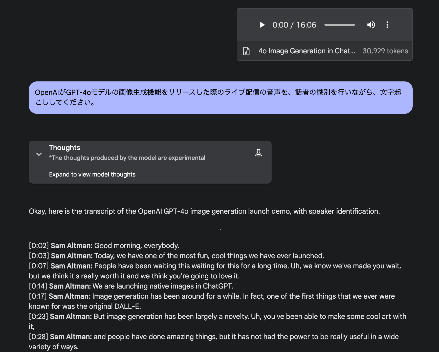 例えば、試しにOpenAIが行ったYouTube上でのライブ配信の音声を、Gemini 2.5 Proにアップロードし、話者を区別した上で文字起こしするように依頼してみると、見事に話者識別あり・タイムスタンプありで文字起こしに成功した。