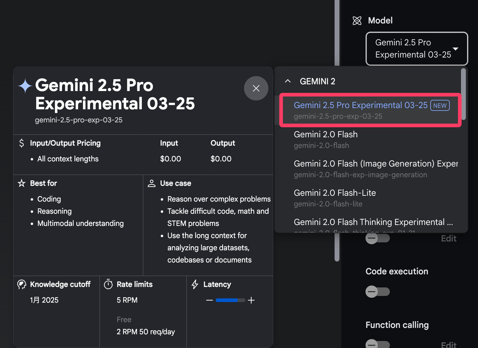 右側にモデルセレクタがあるので、プルダウンメニューから最新の「Gemini 2.5 Pro Experimental 03-25」を選択する。