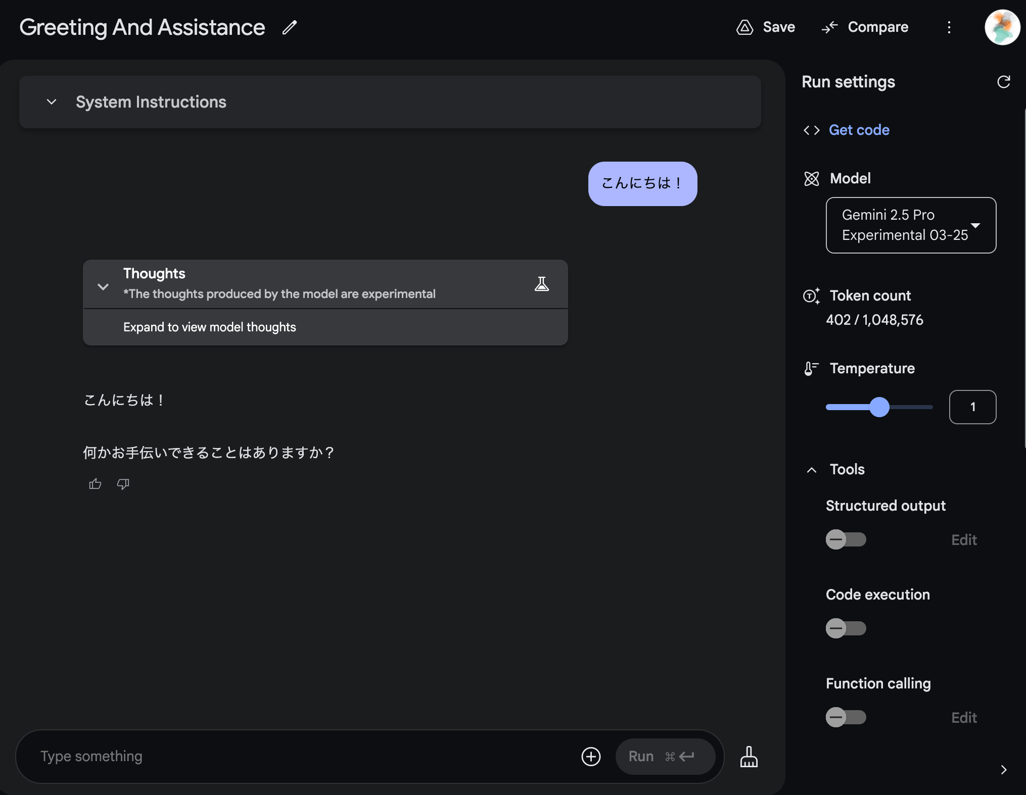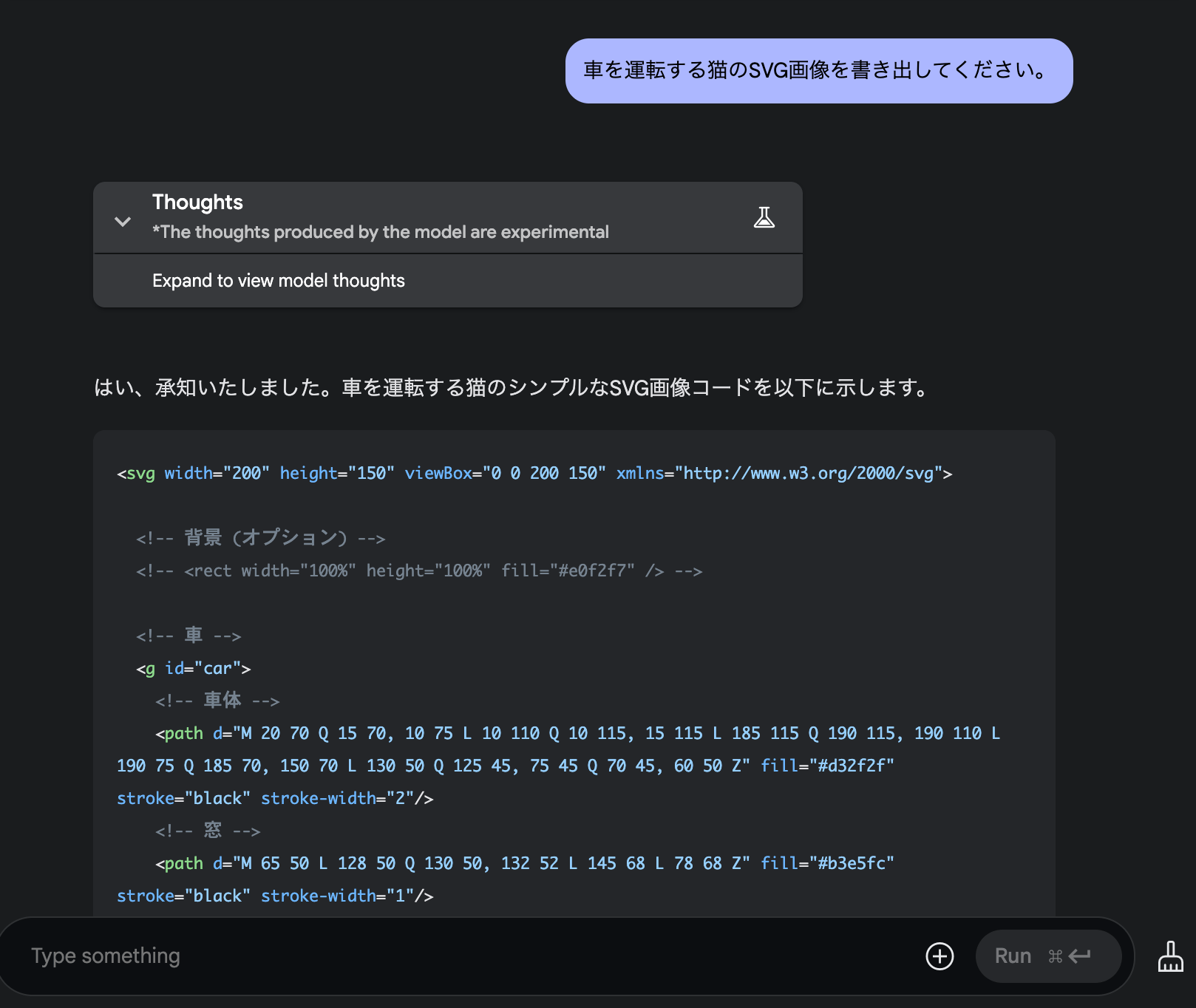 あとは普通に画面下部のテキストボックスから、質問をテキストで打ち込み、「Run」ボタンをクリックすれば、Gemini 2.5 Proモデルからの回答が生成される。