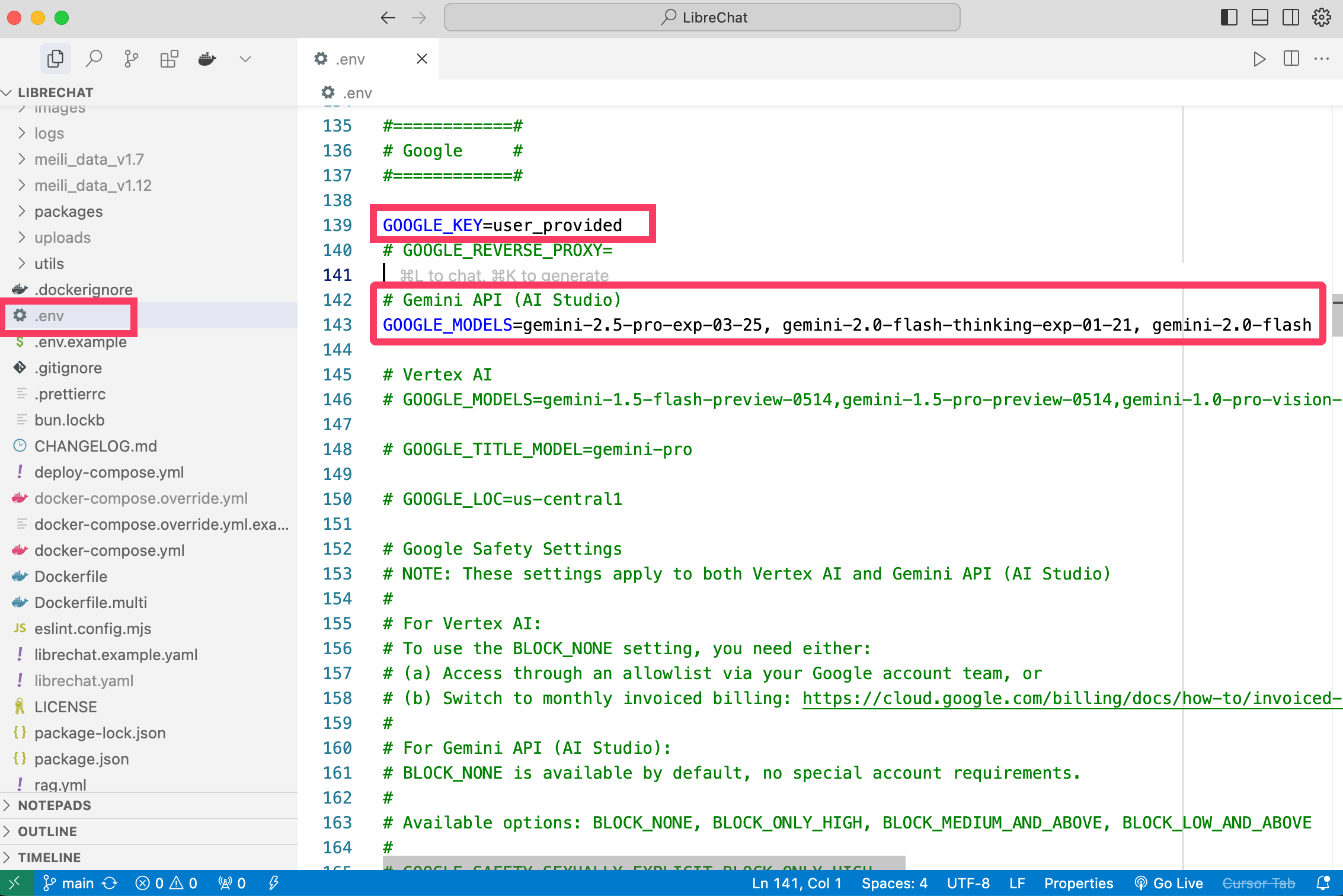 APIキーが用意できたら、今度はLibreChatの設定ファイルを編集し、GeminiのAPIキーと、「Gemini 2.5 Pro Experimental」というモデル名を登録する。