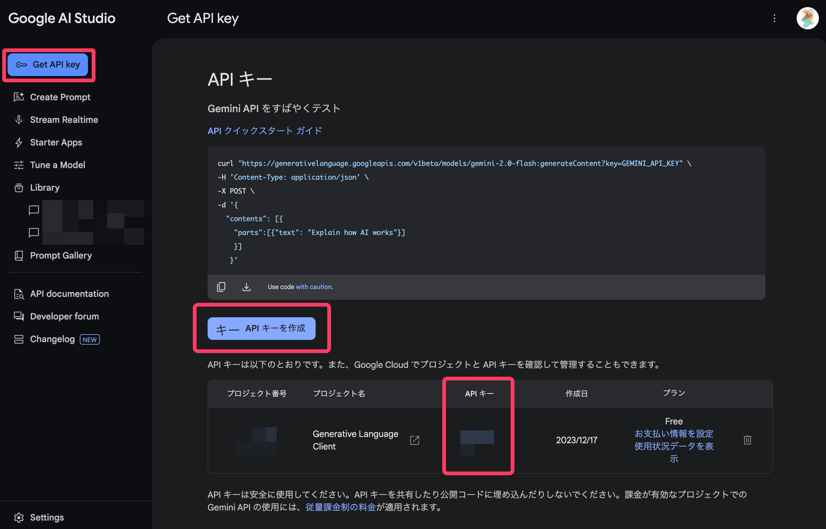 Google AI Studioでは、Geminiモデルを無料で利用するためのAPIキーを発行できるので、「Get API key」ボタンをクリックして、「APIキーを作成」してキーをコピーしておく。