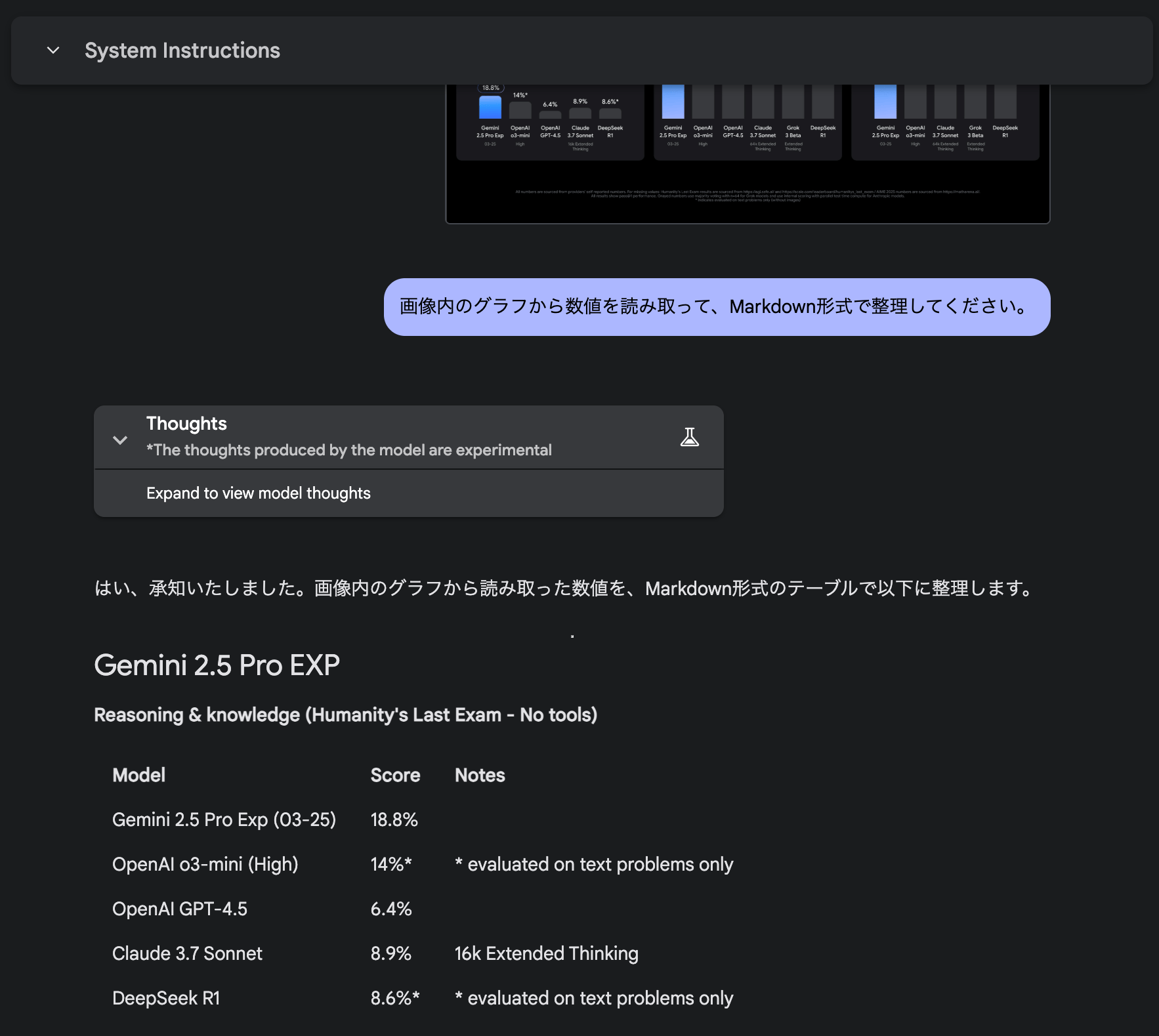 上記でも紹介した、Googleのリリースに掲載されているGemini 2.5 Proのベンチマーク結果のグラフをアップロードして、画像から数字を読み取って表に整理するように依頼してみた。