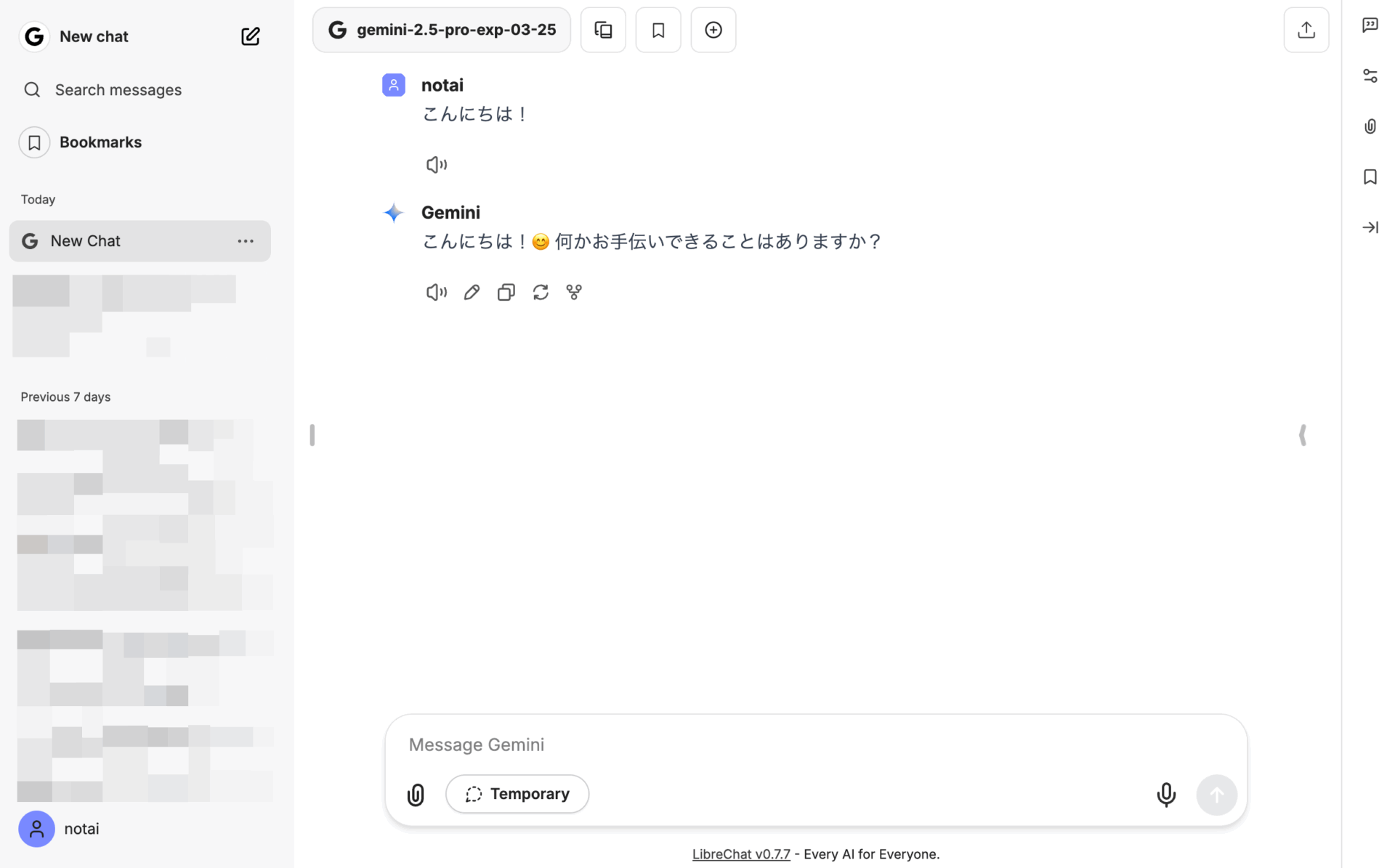 また、GOOGLE_MODELSのところに、gemini-2.5-pro-exp-03-25と書いておくことで、Gemini 2.5 Pro ExperimentalがLibreChat上で利用可能になる。