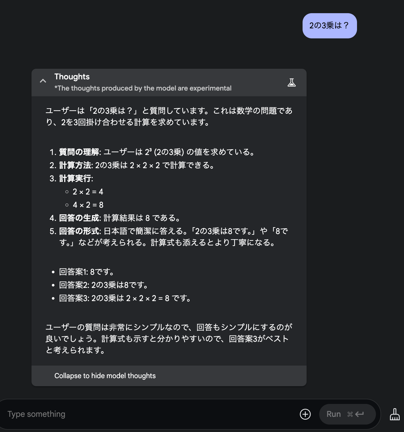 推論モデルの思考過程では、ユーザーからの質問を細かいステップに分解して、自問自答の経過をテキストとして生成しながら、ユーザーへの最終回答を検討する。例えば、以下はGemini 2.5 Proに、2の3乗の答えを尋ねた際の「思考」過程だ。