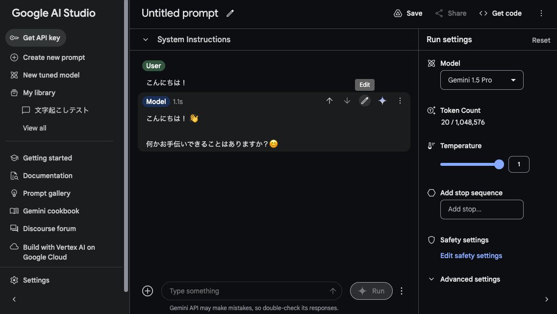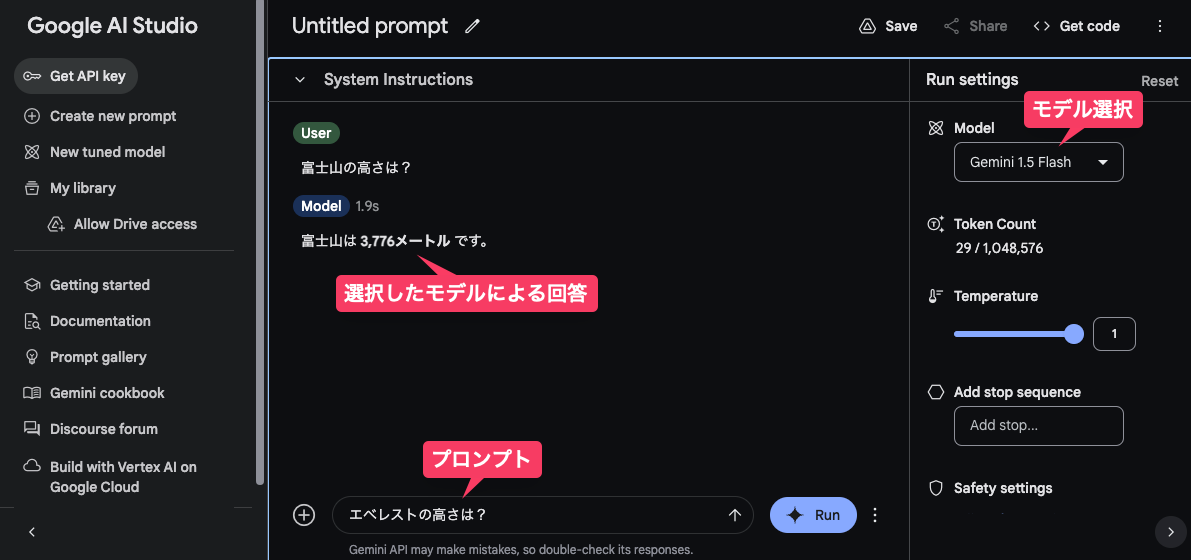 こちらは、上記のチャットUIのように大衆向けに使いやすくされたアプリではなく、エンジニアが、Geminiを組み込んだアプリを作る際に、様々なプロンプトのテストなどを行うことができる環境だ。