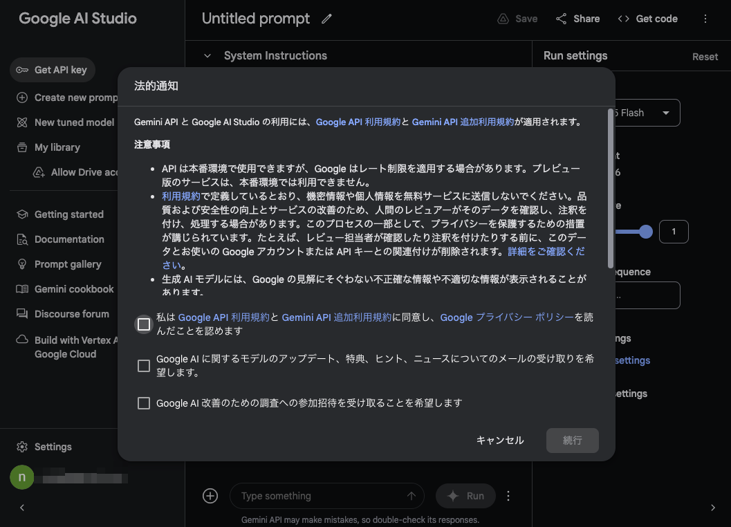アカウントへのログインが完了すると、Google AI Studioの以下のような画面が開く。