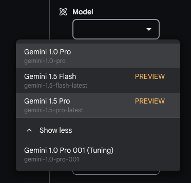 右上のモデル選択では、Gemini 1.0 Pro、Gemini 1.5 Pro、Gemini 1.5 Flashを選ぶことができる。