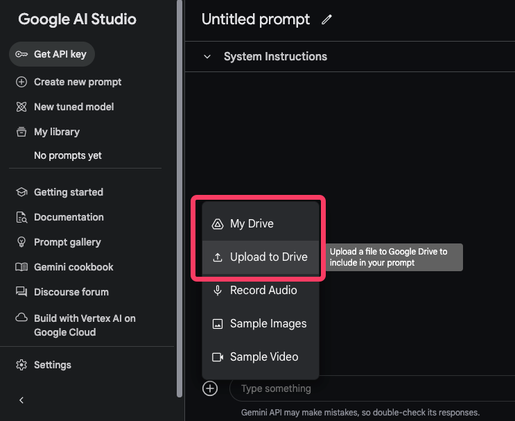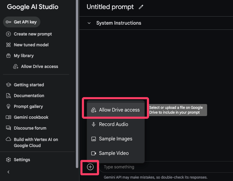 Google AI Studioのプロンプト入力欄の左側にある「+」ボタンをクリックすると、「Allow Drive Access」というGoogleドライブとの接続メニューがあるので、これをクリックする。