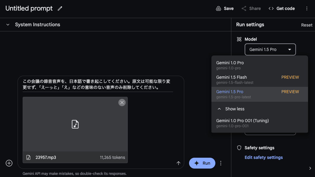 Google AI StudioでGemini 1.5 Proに文字起こしをさせたら、そのまま議事録として要約するようプロンプトで指示すれば、議事録の作成まで完結させることができてしまう。