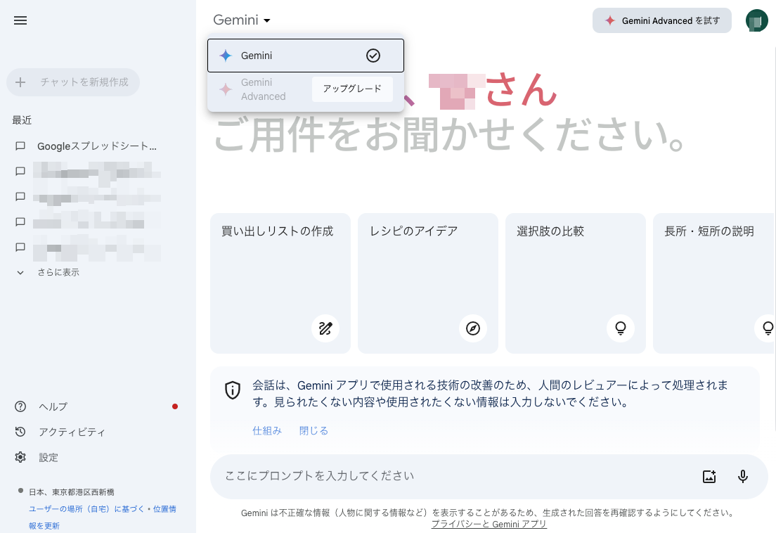注意事項などに同意すれば、早速Geminiの各モデルを使ったチャットが利用できる。