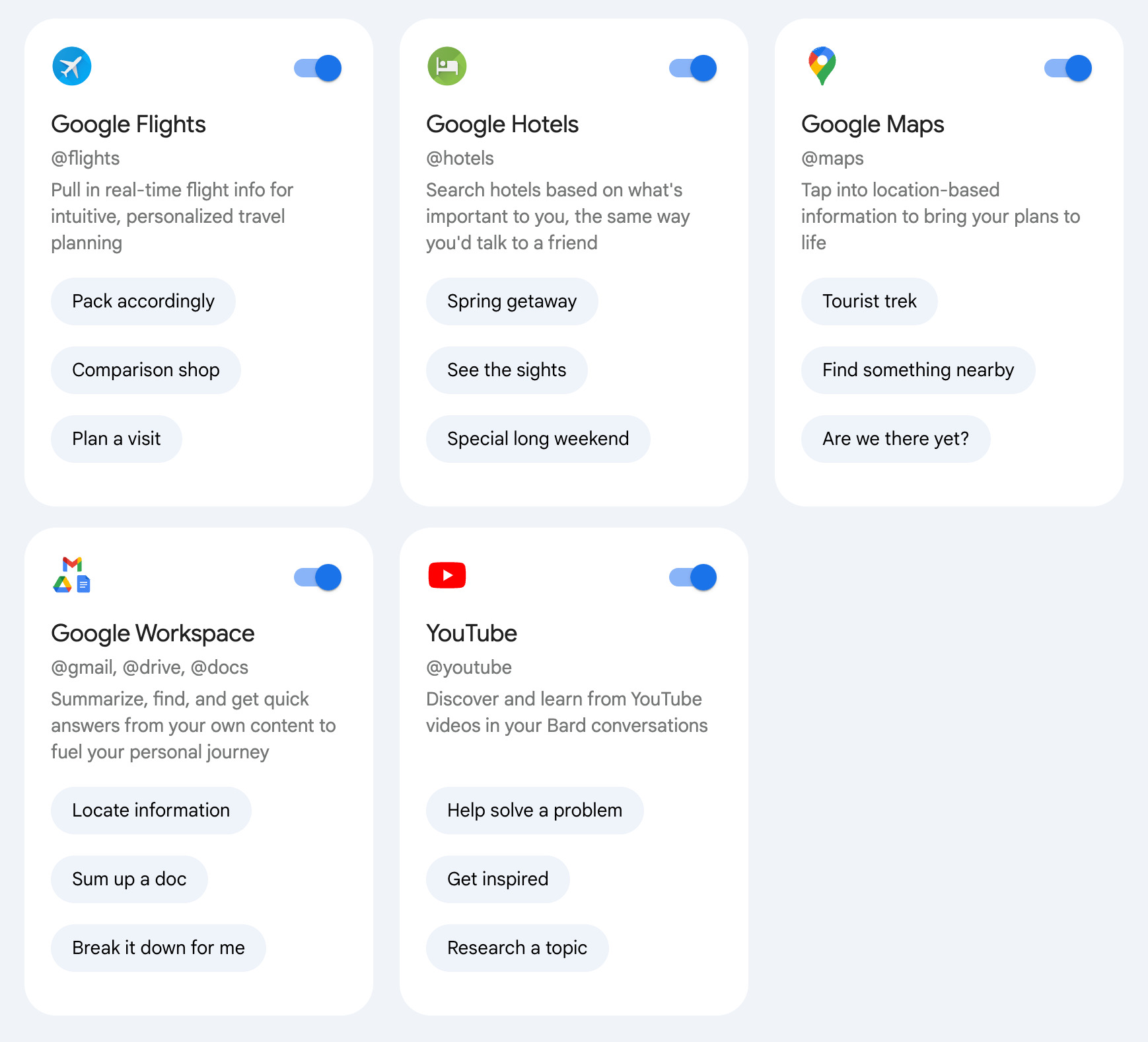 これらのアップデートは、「Bard Extensions」と呼ばれ、BardがGmail、Docs、Drive、Googleマップ、YouTube、Googleフライト、ホテルなどの人気Googleツールから情報を取得し表示することができるようになった。