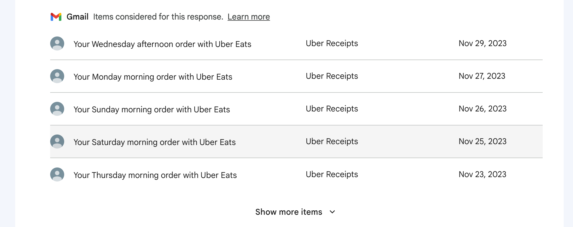 Find emails related to payments made in the past monthすると見事、私のメールボックスにあったUber Eatsの注文履歴のメールや、各種ウェブサービスへの支払い履歴を過去1ヶ月分だけ的確に抽出して表示してくれた。