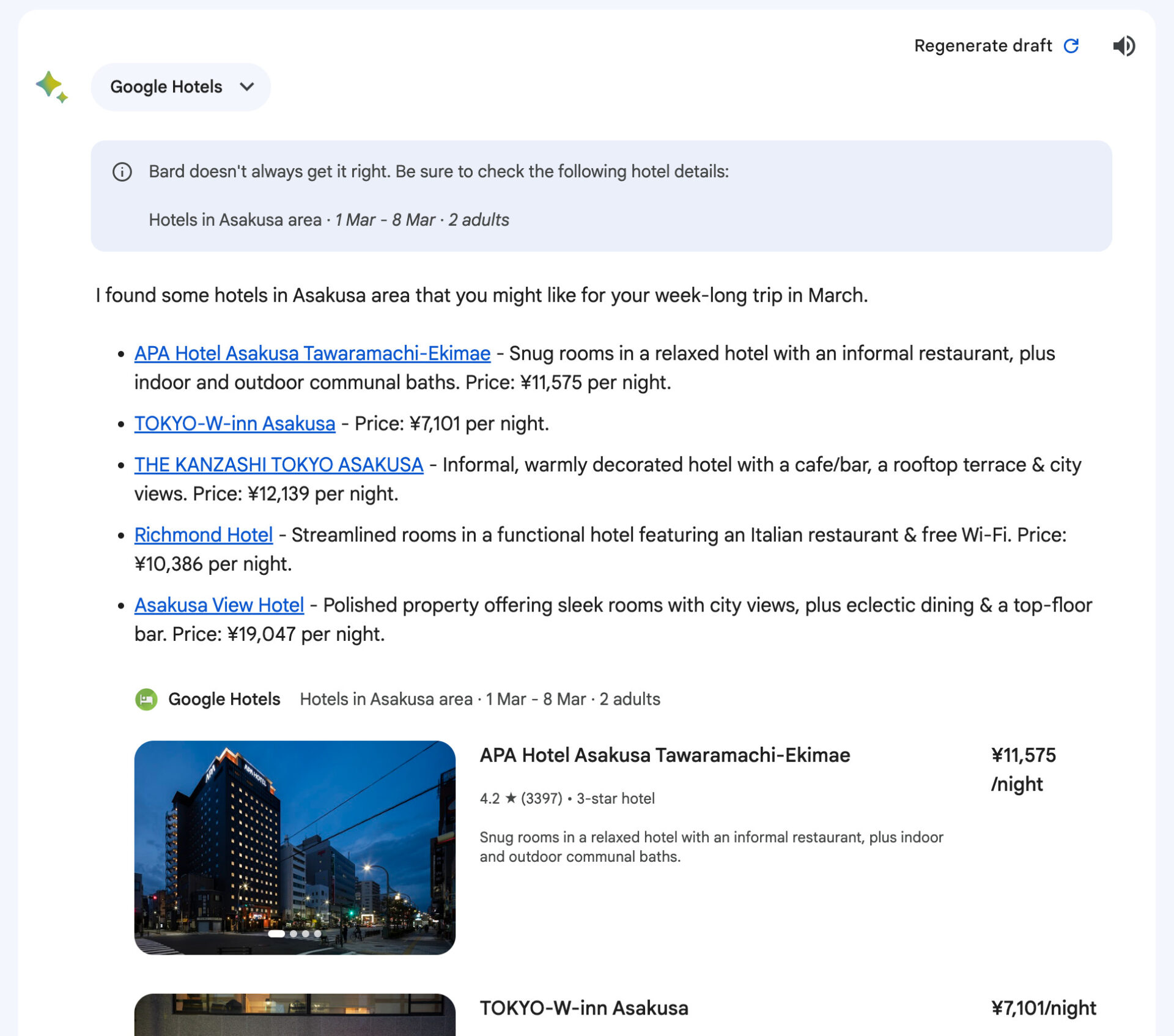 例えば、実際に3月に1週間浅草のホテルに滞在することを想定してBardにホテルを聞いてみた。