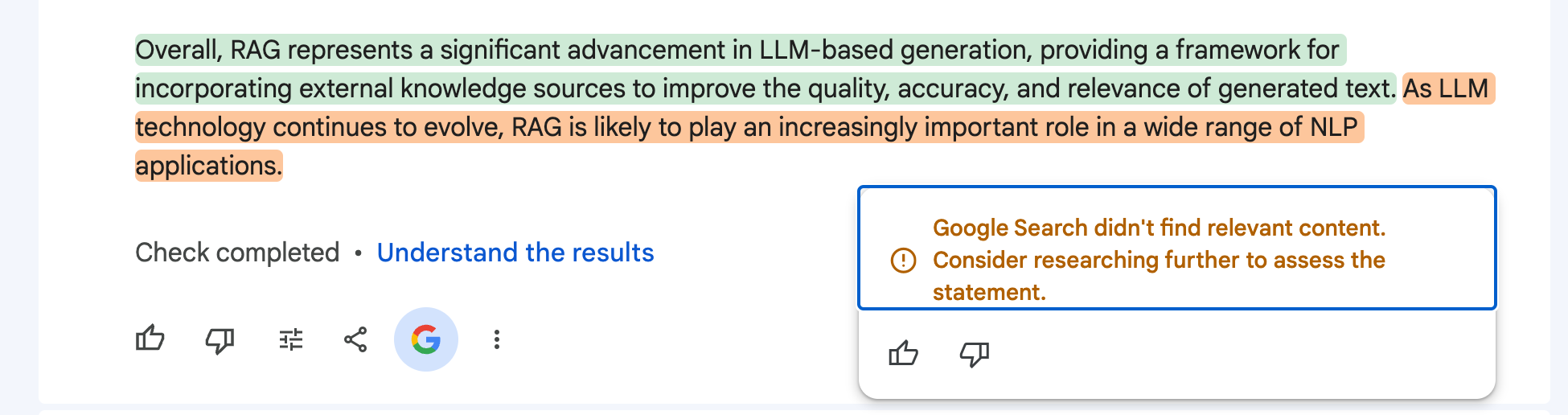 Hallucinationsを防ぎ、事実と異なる誤った回答の可能性がある場合に、アラートが表示されるという、大規模言語モデルのAIの欠点を補う非常に先進的な機能だ。