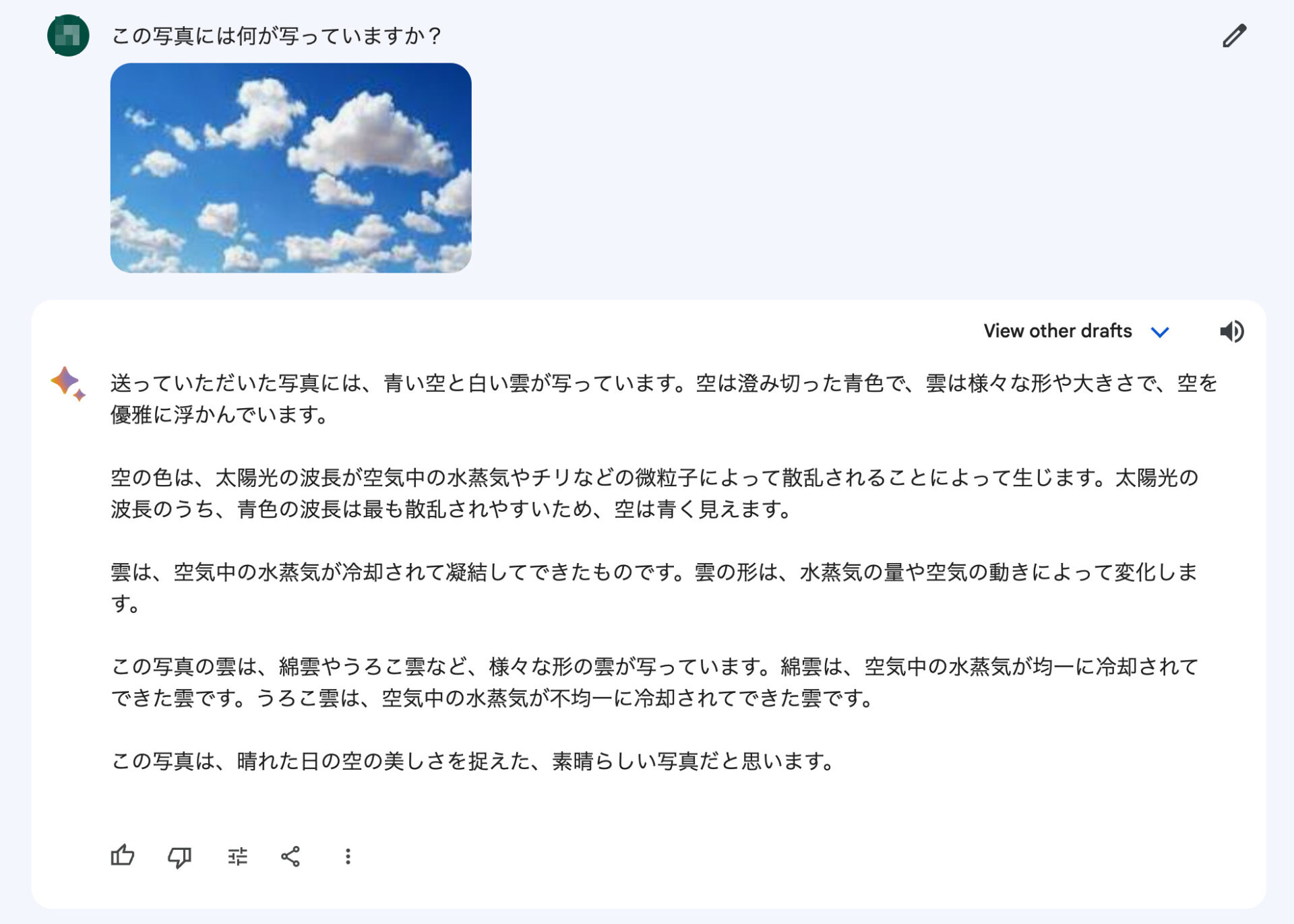 ChatGPTに与えたのと同じ青空の写真を、Google Bardに同じプロンプトで解析させてみたのが以下だ。