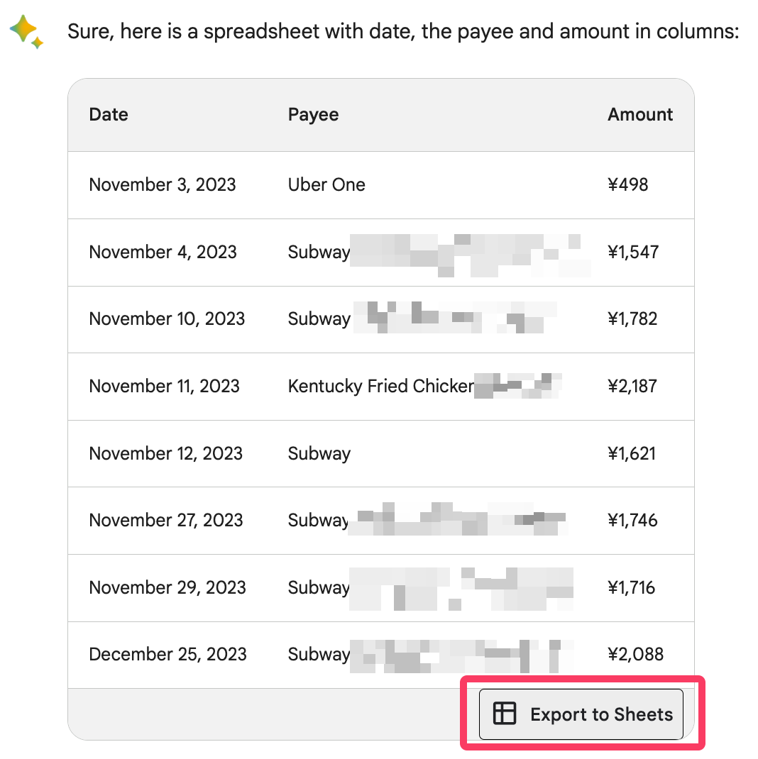 例えば、前項のように、表形式・CSV形式でデータを整理するようにBardに頼み、テーブルが出力されたら、右下に「Export to Sheets」というボタンが表示される。