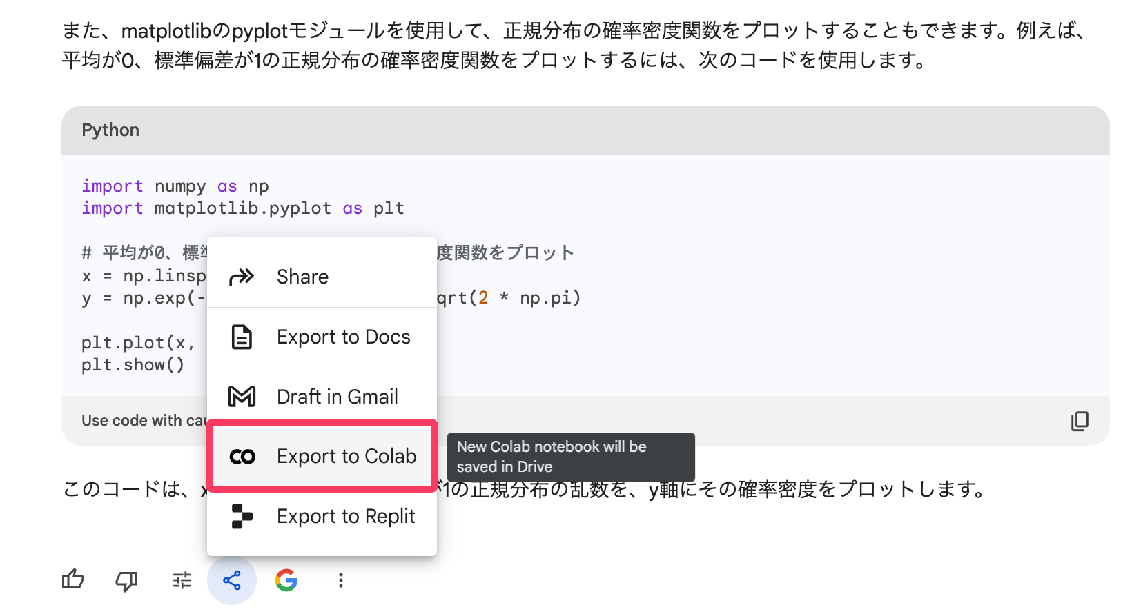例えば、正規分布に従う乱数を生成させてヒストグラムを表示するPythonコードをGoogle Bardに質問して書いてもらった上で、回答の左下にある共有ボタンから、「Export to Colab」を選択すると、Google Colab上で実際にこのコードを実行してヒストグラムを描写することができる。