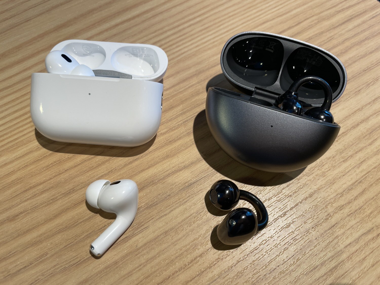 カナル型のApple AirPods Pro 2と、オープンイヤー型のHuawei FreeClip