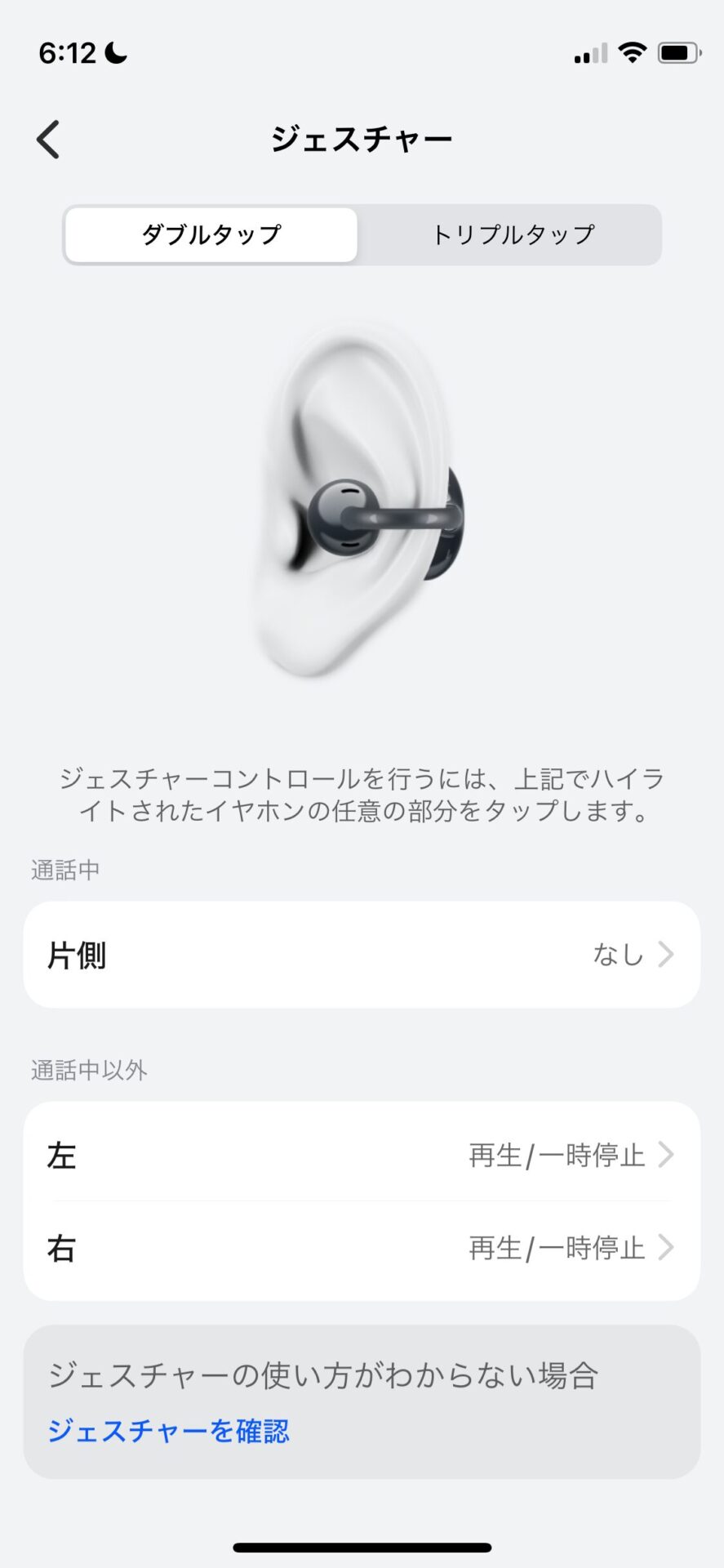 本体のブリッジ部分をダブルタップすると音楽を一時停止できたり、トリプルタップすると次の曲を再生したり、ジェスチャー機能を備えており、ジェスチャーの割り当てもアプリから変更が可能だ。