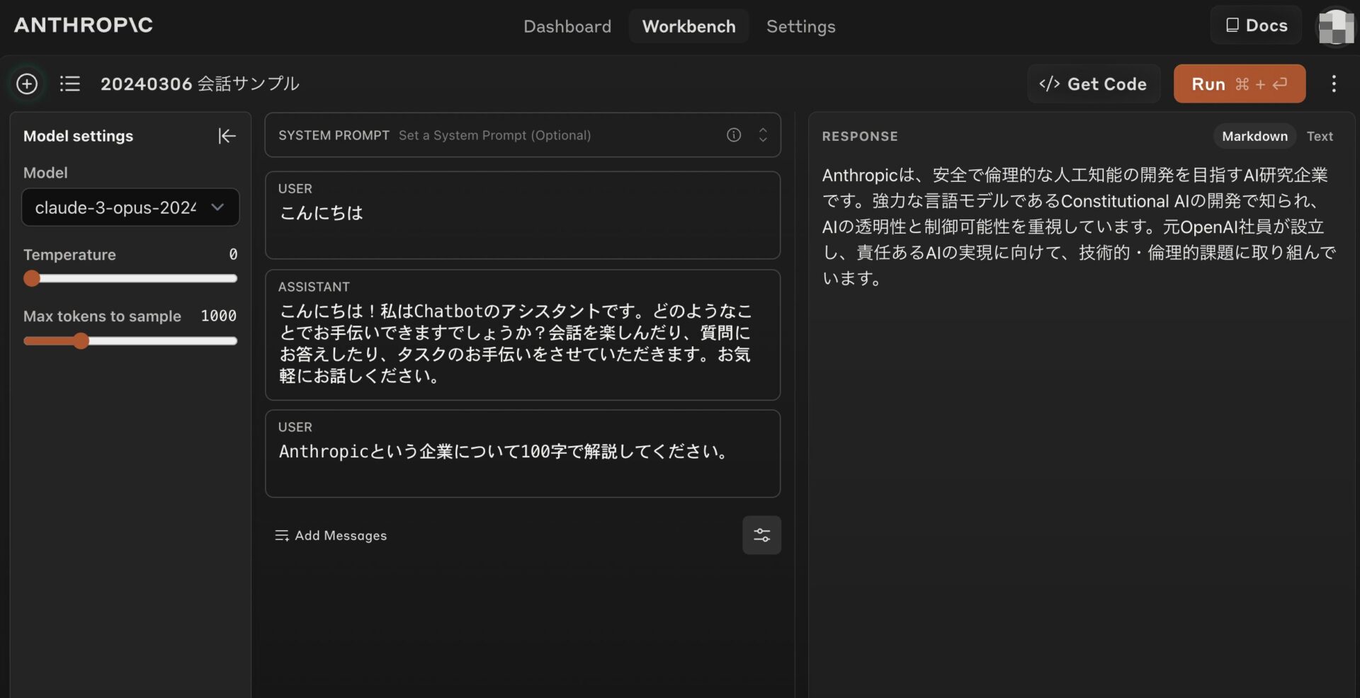 APIの画面にログインした状態で、「Workbench」というタブを開くと、Claude 3のモデルを選択して、プロンプトを入力して、実際のモデルの挙動を確認することができる。