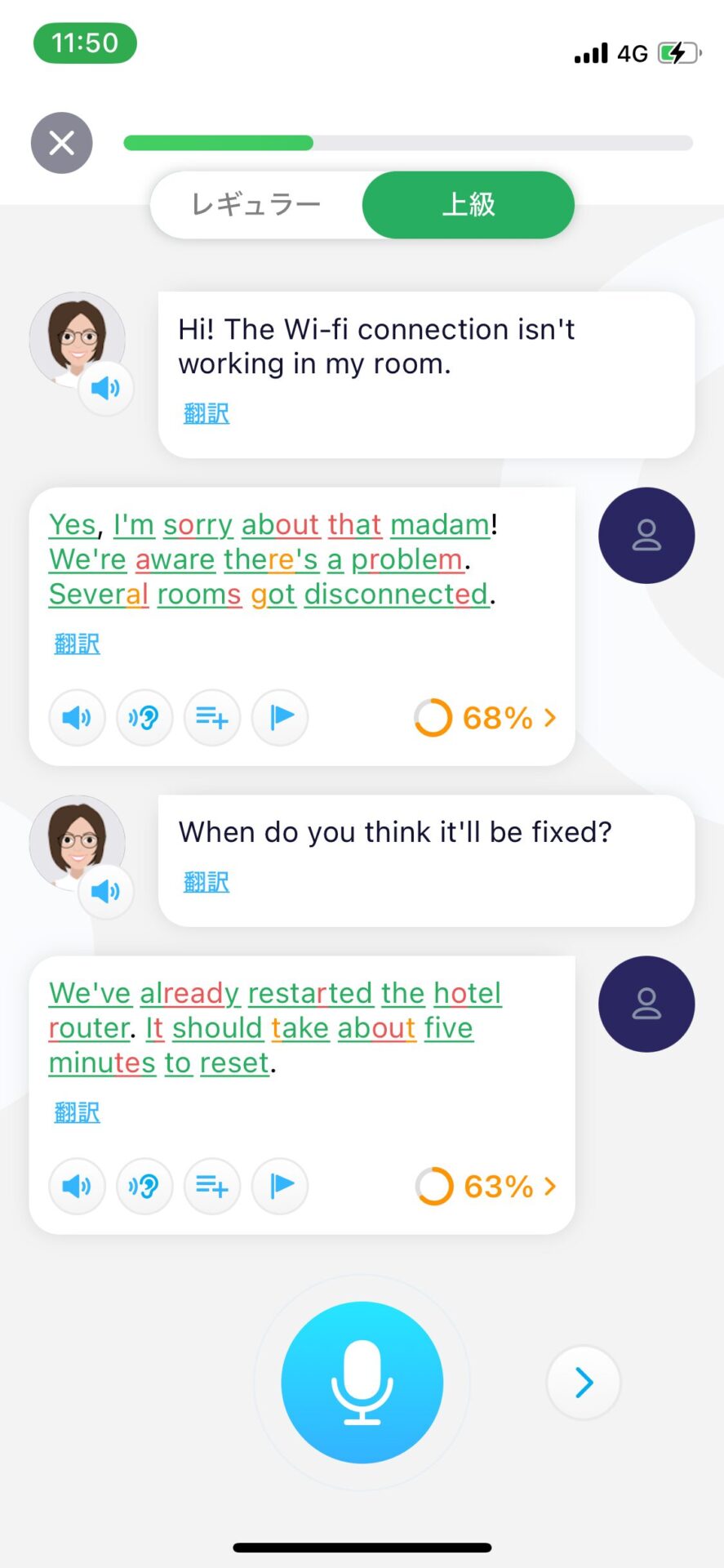 少しでも発音が変なところがあれば、該当する音節が黄色・赤色にハイライトされる。うんざりするぐらいに細かい発音矯正を受けることができる。