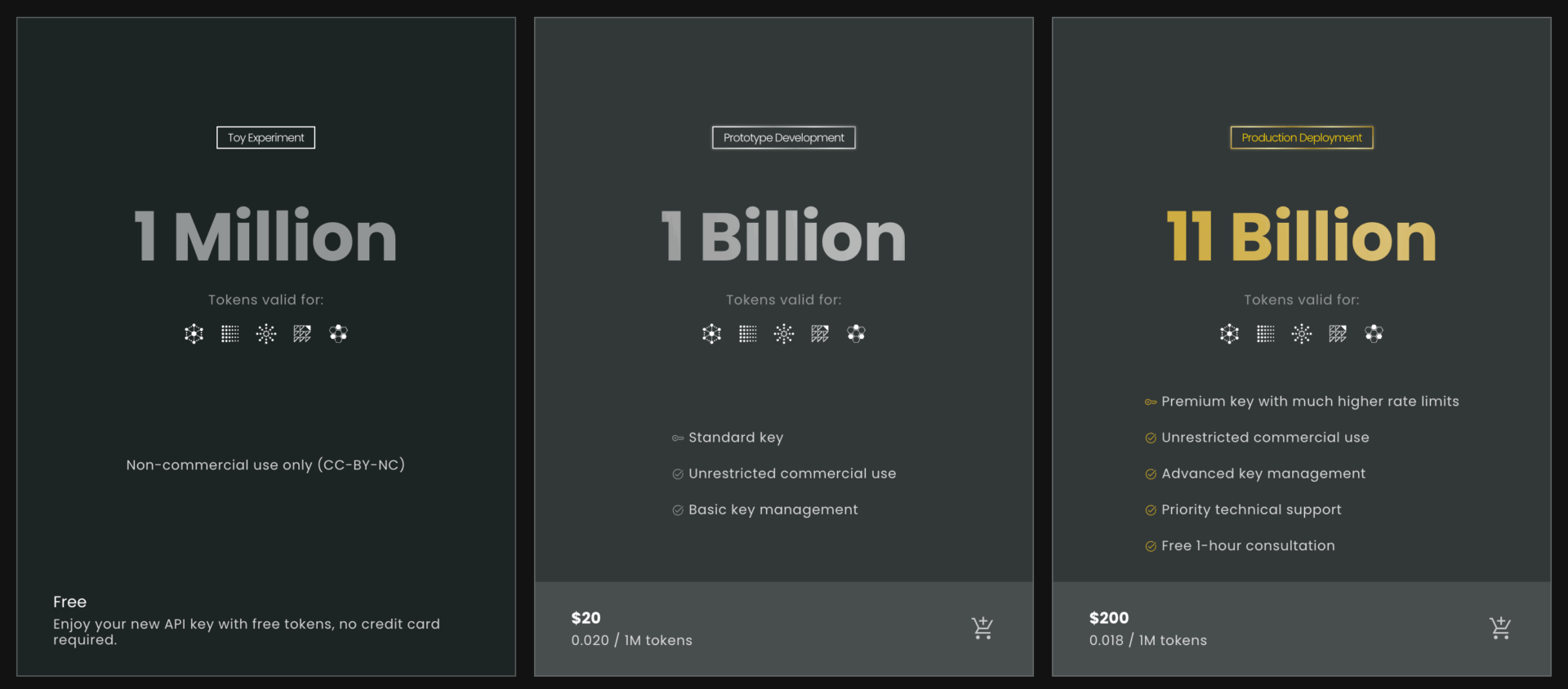 APIキーを使う場合、非商用利用なら100万トークンまで無料、商用利用したい場合には20ドルで10億トークンのプラン、アプリ等に組み込みたい場合には200ドルで110億トークンのプランが必要だ。