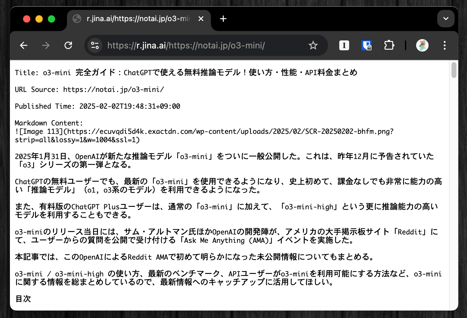 :/o3-mini/)をコピーして、冒頭にjinaのURLを足す(例:r.jina.ai/https://notai.jp/o3-mini/)。