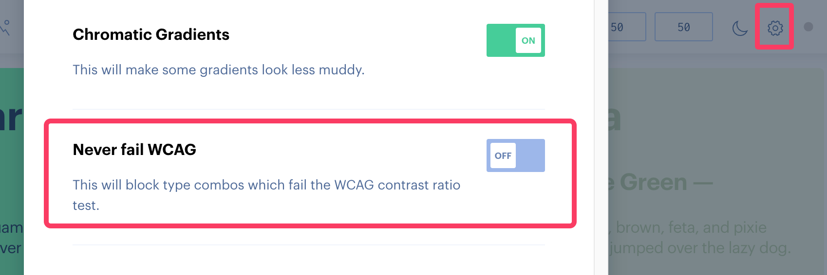 Khromaの右上にある歯車マークをクリックして設定を開き、「Never fail WCAG」をオンにすると、WCAG基準を満たさない色の提案が消える。