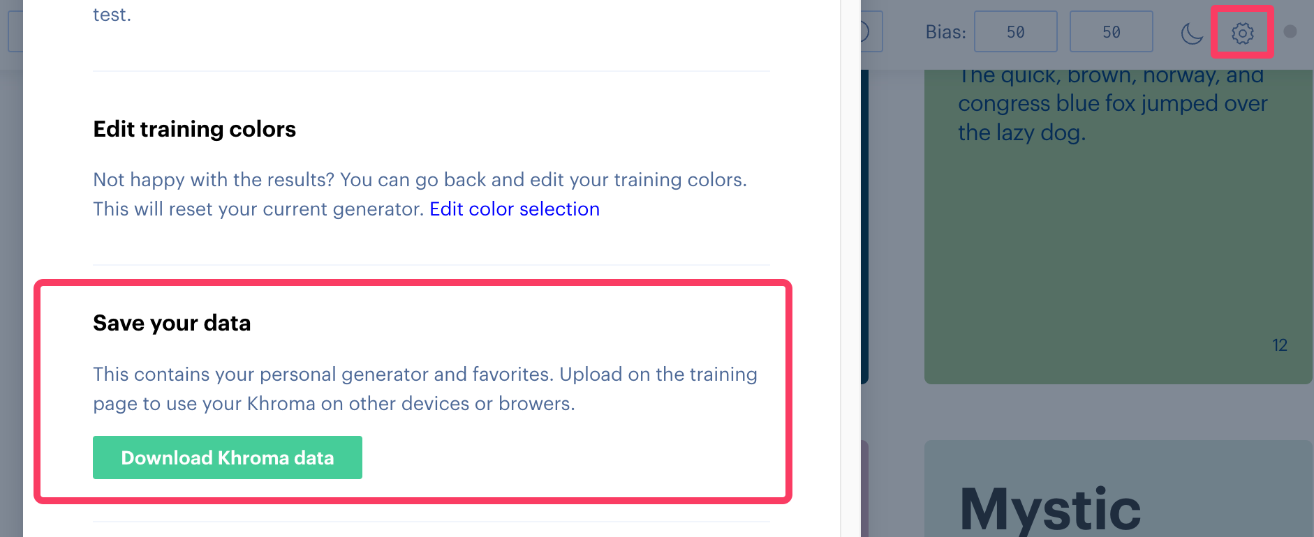 Khromaの右上にある歯車マークをクリックして設定を開き、「Download Khroma data」をクリックする。