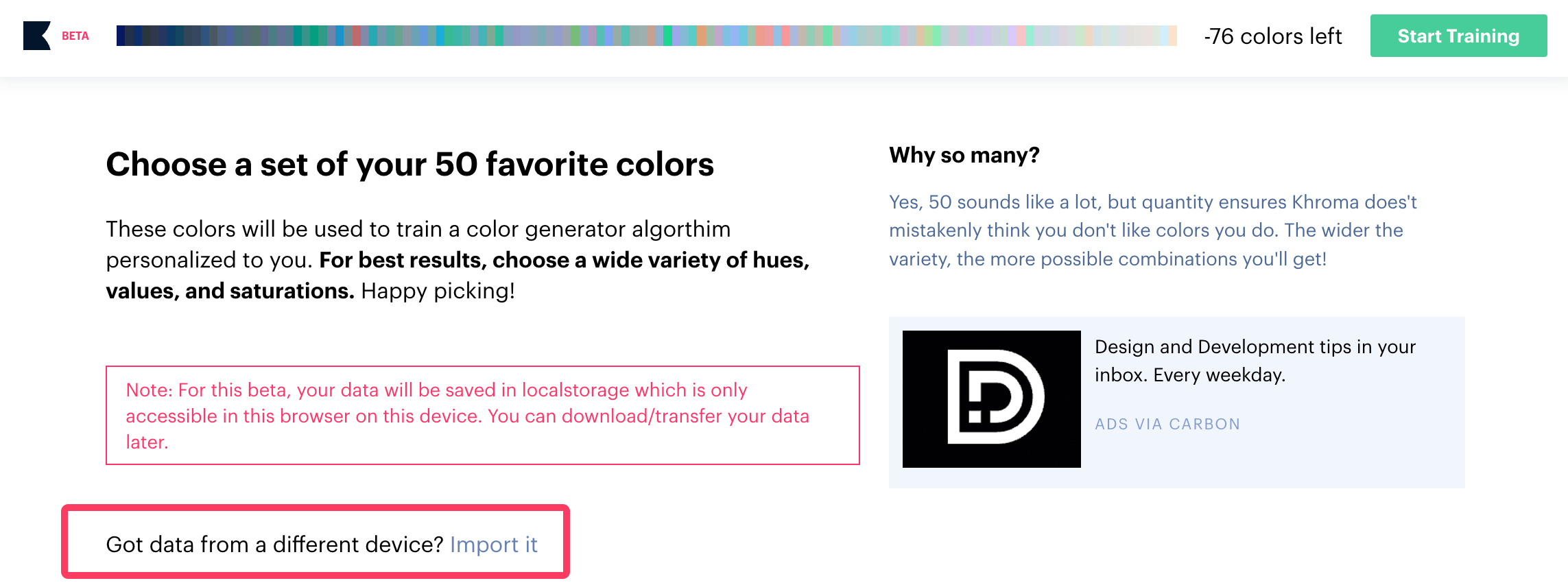 Khromaを開き直し、最初の50色を選ぶ段階で、「Import it」という箇所から先ほどダウンロードした.jsonファイルをアップロードすれば、保存したカラーパレットを復活させることができる。