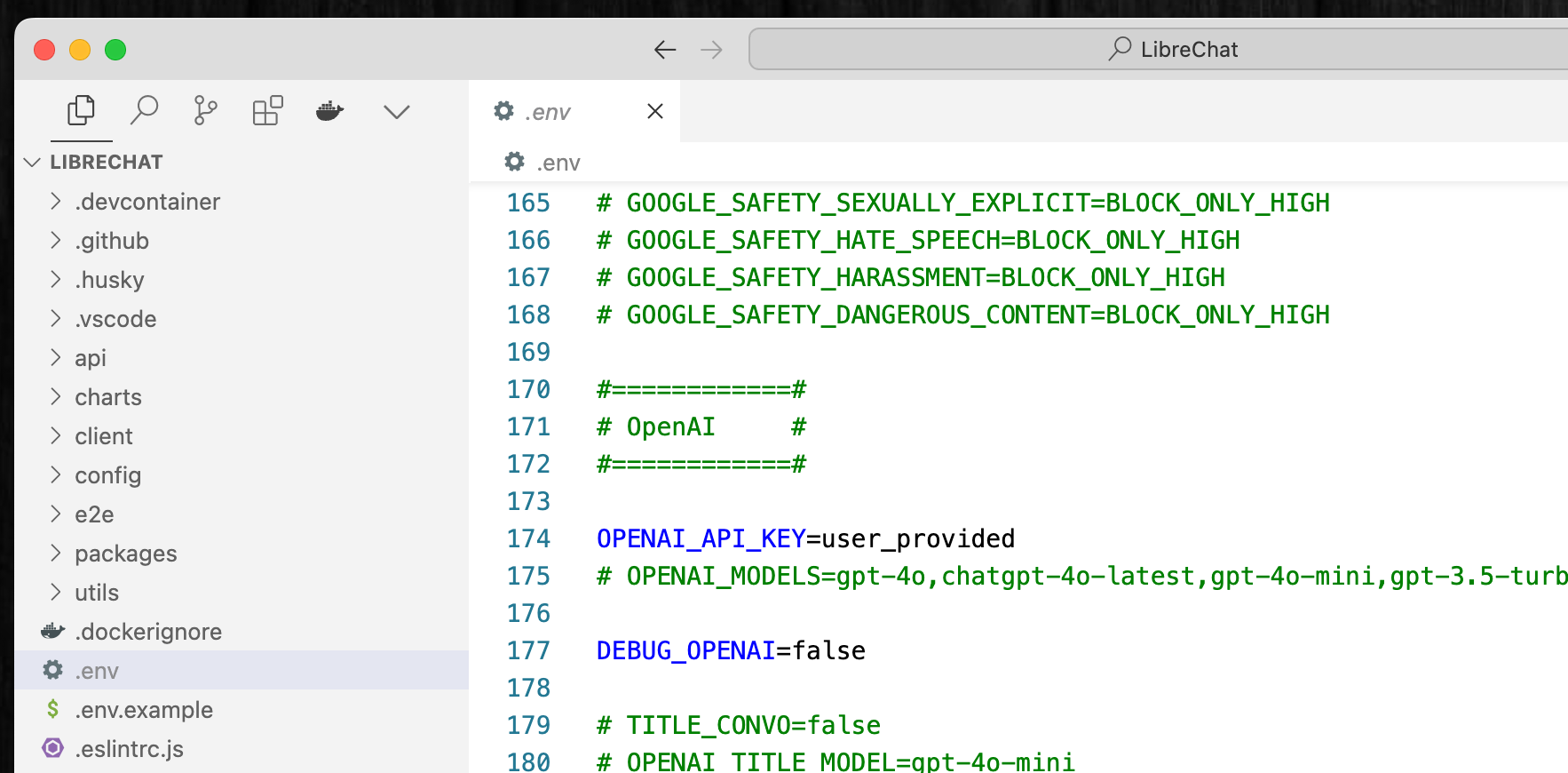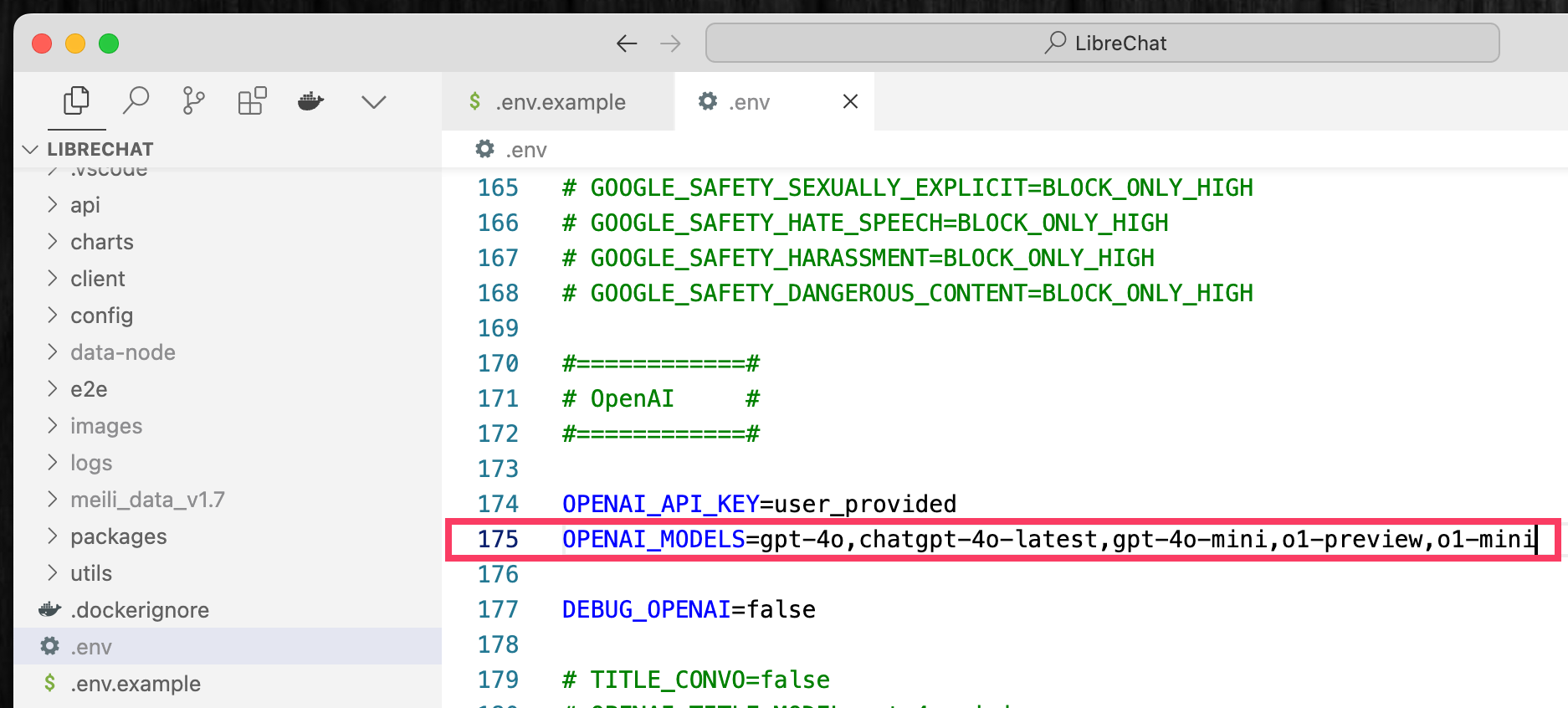 .envファイルの中身には、OpenAIなど各社のAIモデルを列挙する箇所(下の画像の175行目など)があり、これを書き換えることで、不要なモデルを削除したり、新しく登場したばかりのモデルを追記したりして、カスタマイズできるようになっている。