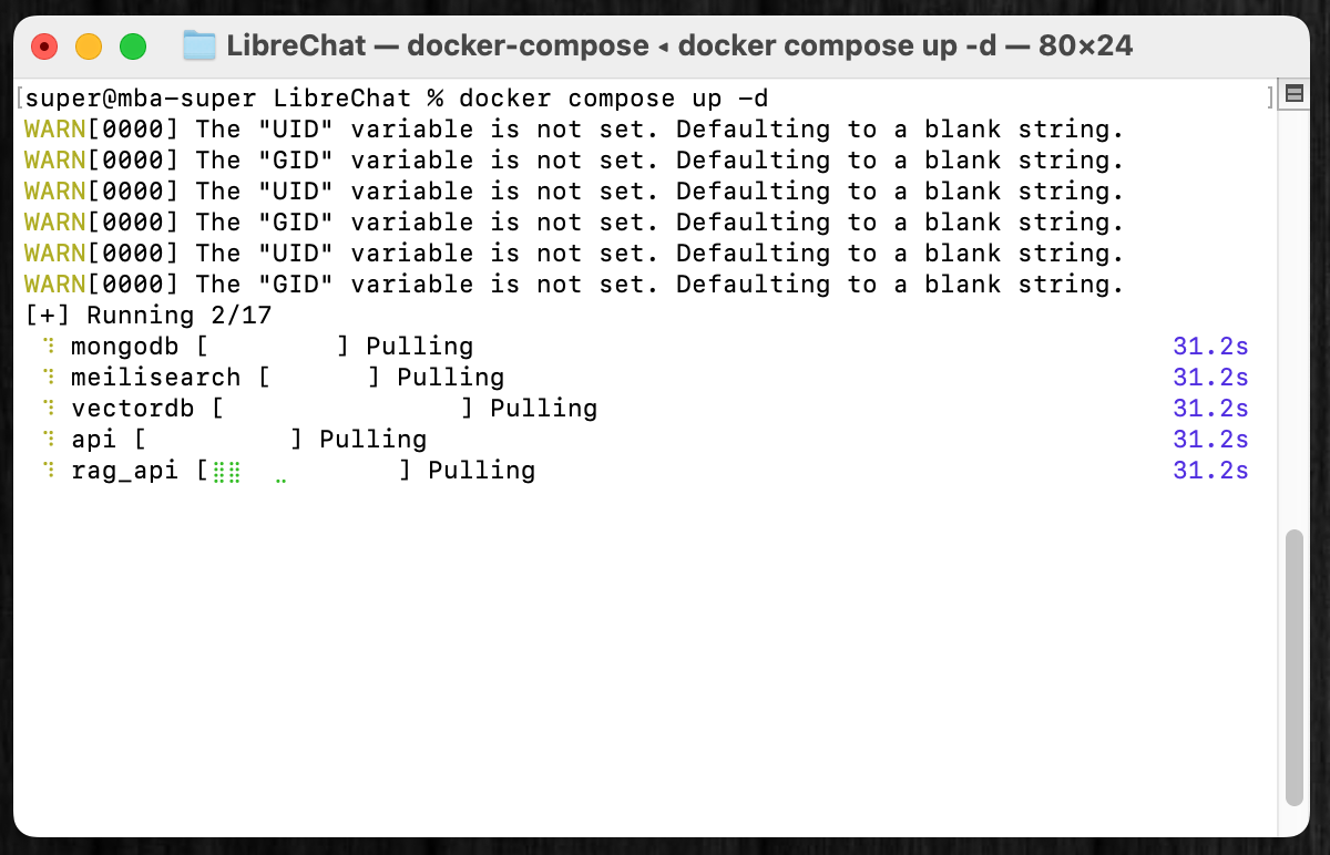 以上で準備は完了で、ターミナルに次のdocker composeコマンドを打ち込んで、いよいよLibreChatが起動できる状態になる。