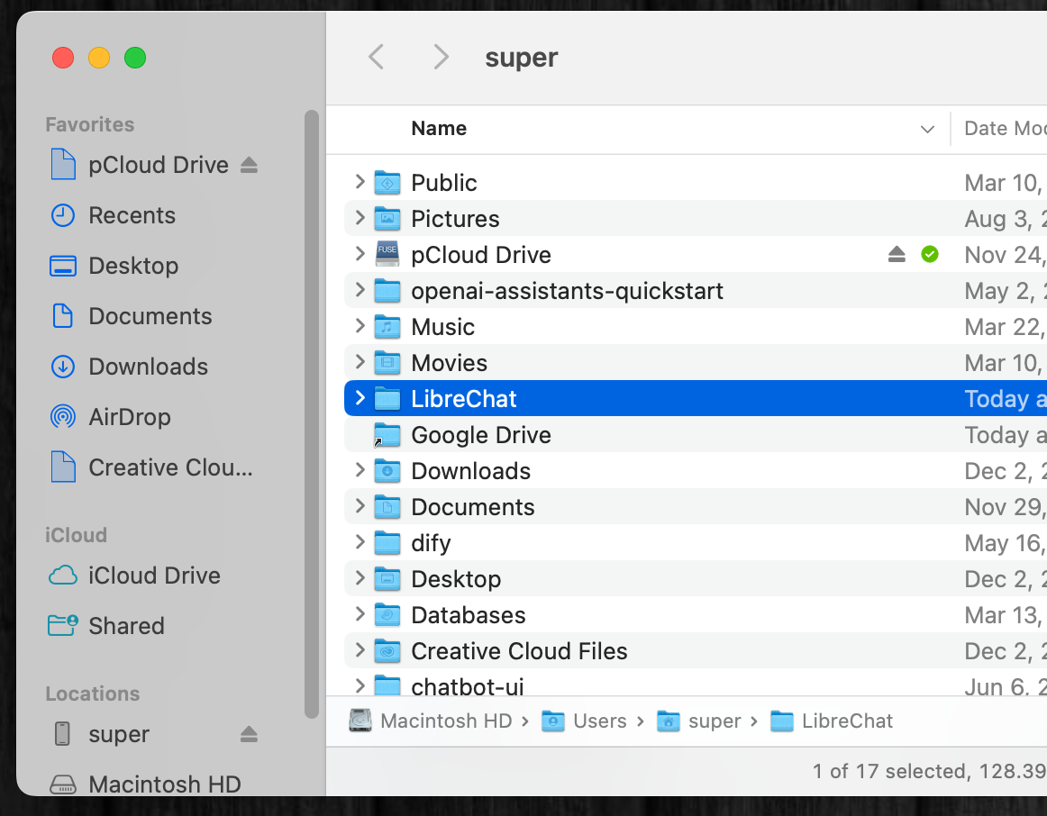 zipを解凍すると「LibreChat」フォルダが現れるので、自身のホームフォルダなど、分かりやすい階層に配置する。