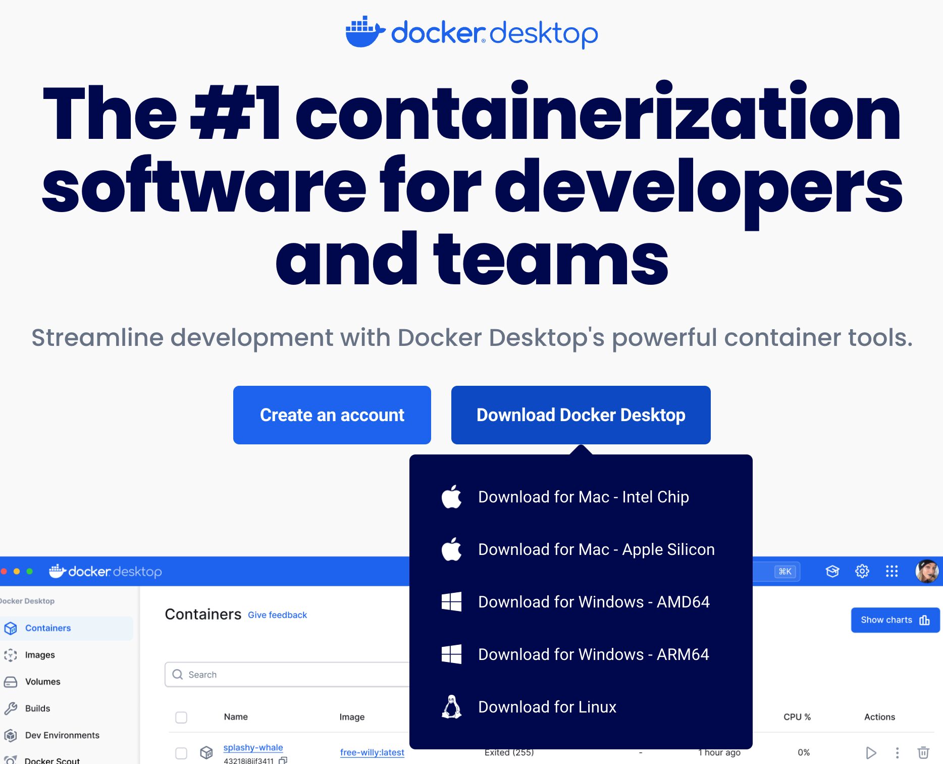 Docker Desktopは、こちらのダウンロードページにアクセスすれば、通常のMac/Windowsアプリと同様に、.dmg/.exeファイルを使って簡単にインストールすることができる。