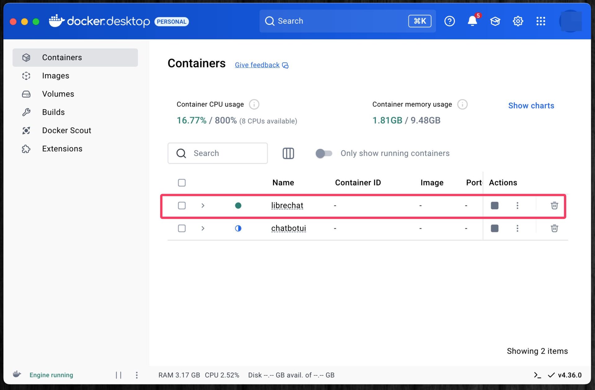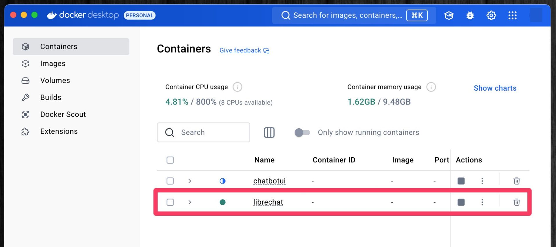 ターミナル上に表示された進捗バーなどが100%になったら、Docker Desktopを開いてみる。コンテナ一覧に、「librechat」というコンテナが表示されていたら成功だ。