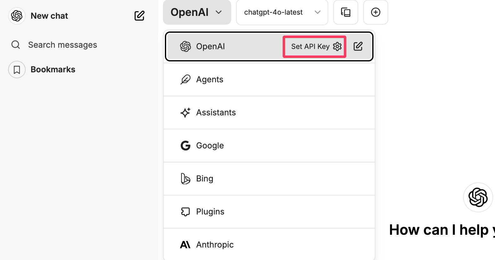 APIキーを控えたら、LibreChatのチャットウィンドウ左上にあるAIプロバイダのプルダウンメニューから、OpenAIにカーソルを合わせ「Set API Key」をクリックする。
