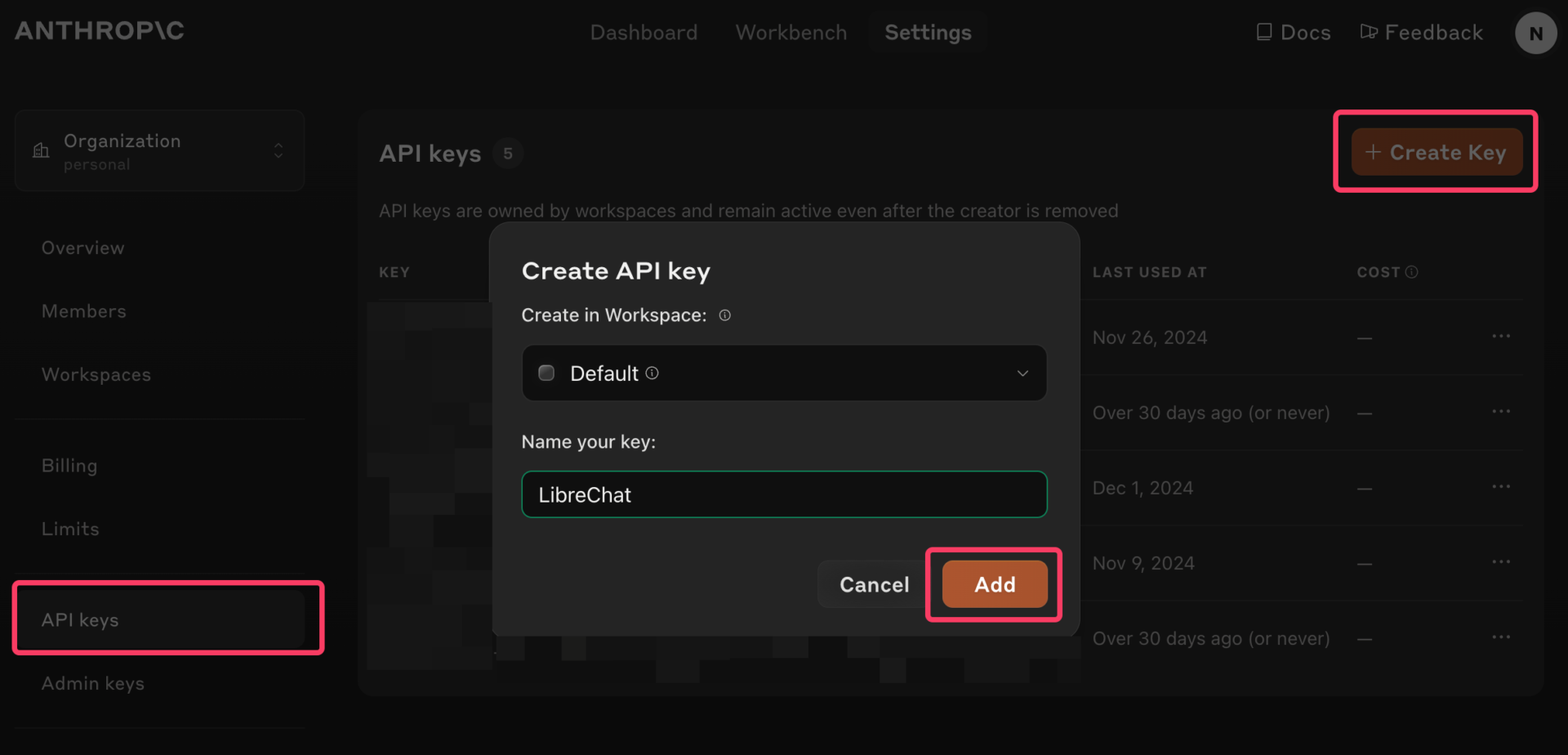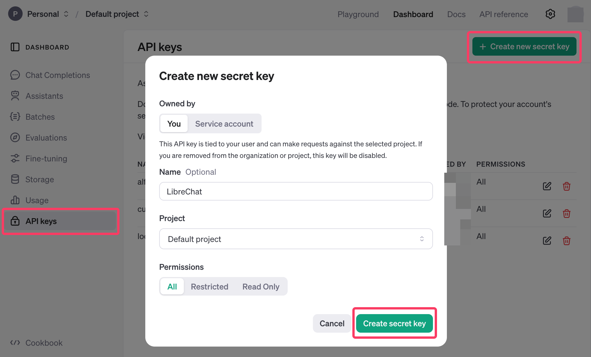 すると、以下のように新しいAPIキーを作成する画面になるので、「LibreChat」など分かりやすい名前をつけて保存する。