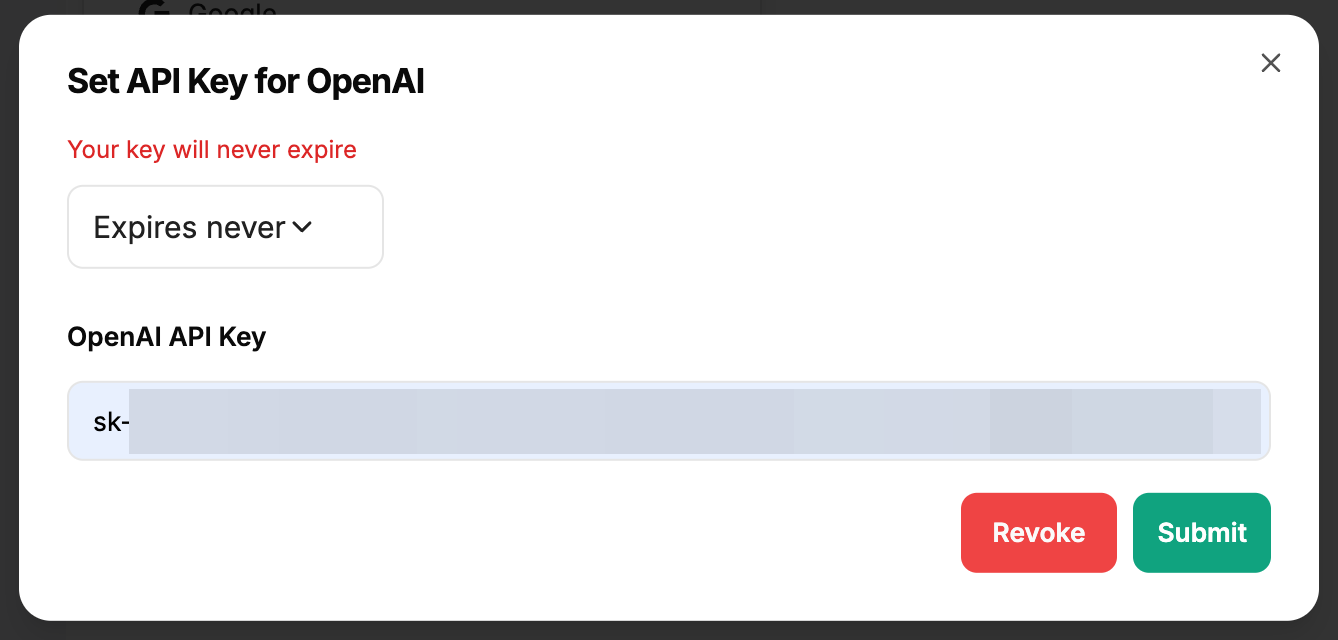APIキーの有効期限を設定できるので、期限切れなしの「Expires never」を選択した上で、先程作成したOpenAIのAPIキーをペーストして「Submit」をクリックする。