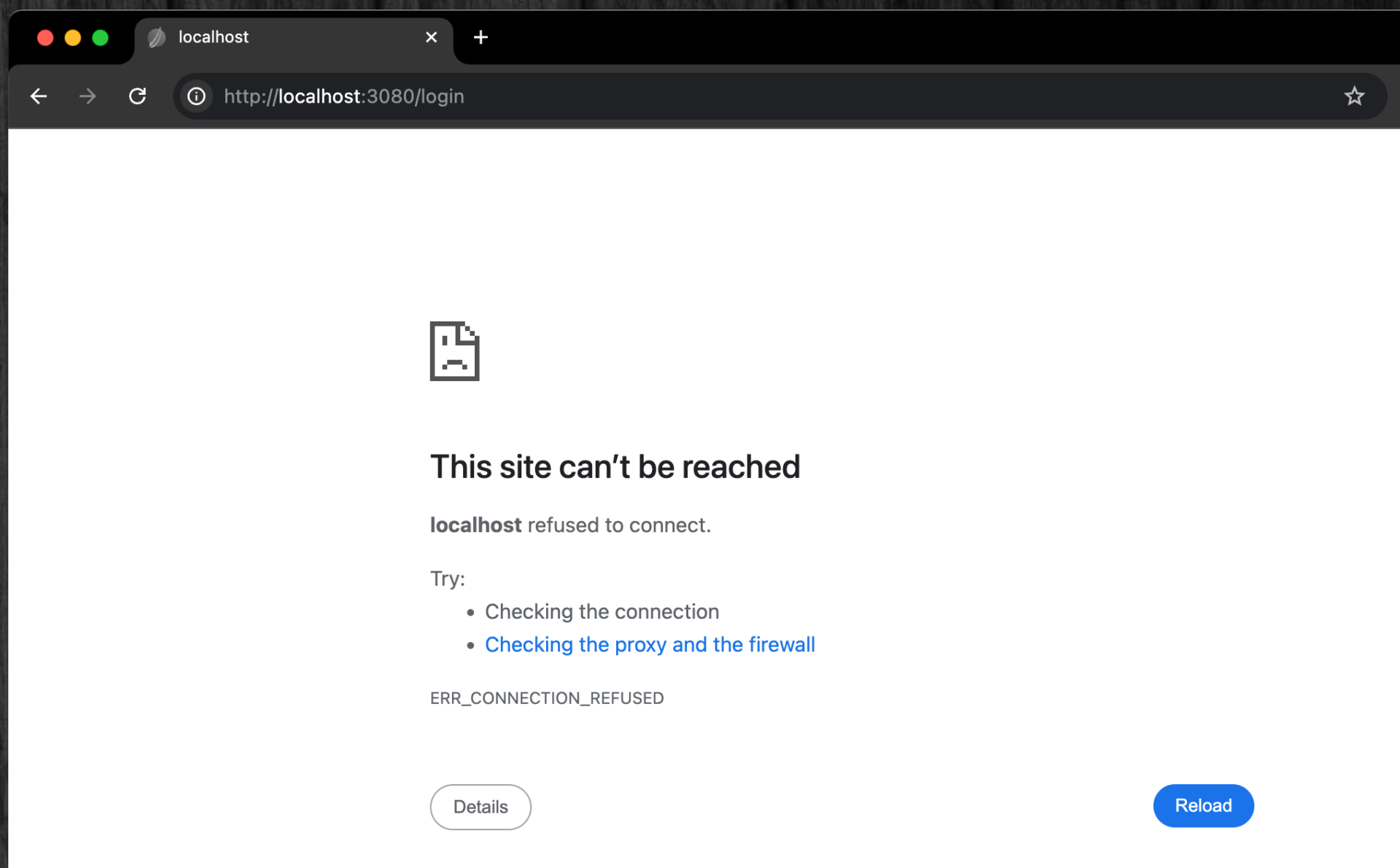 PCを終了すると、Docker Desktopも終了してしまい、コンテナが停止するため、PCの再起動後にhttp://localhost:3080/にアクセスしても、以下のようにエラーが出てしまう。