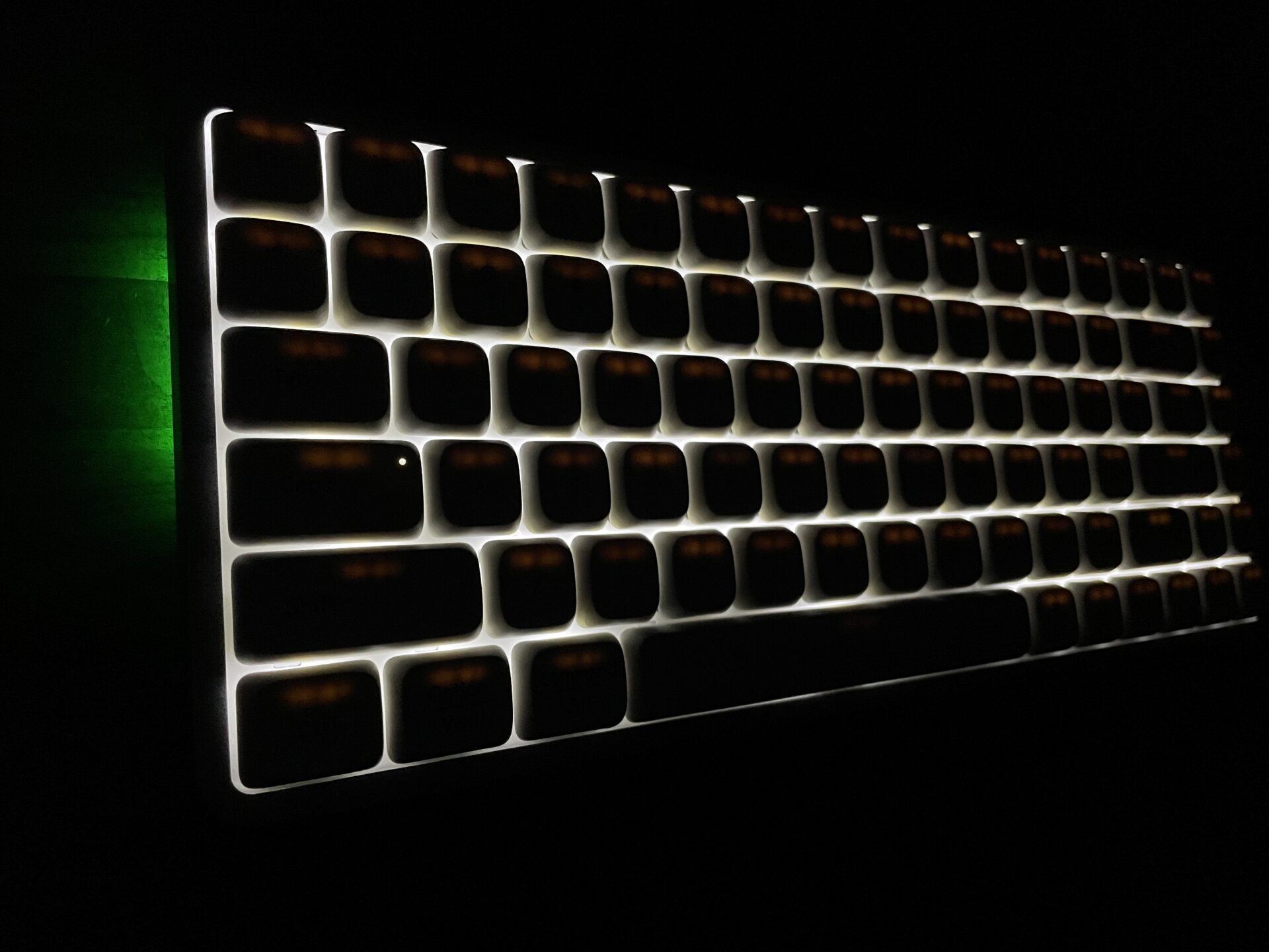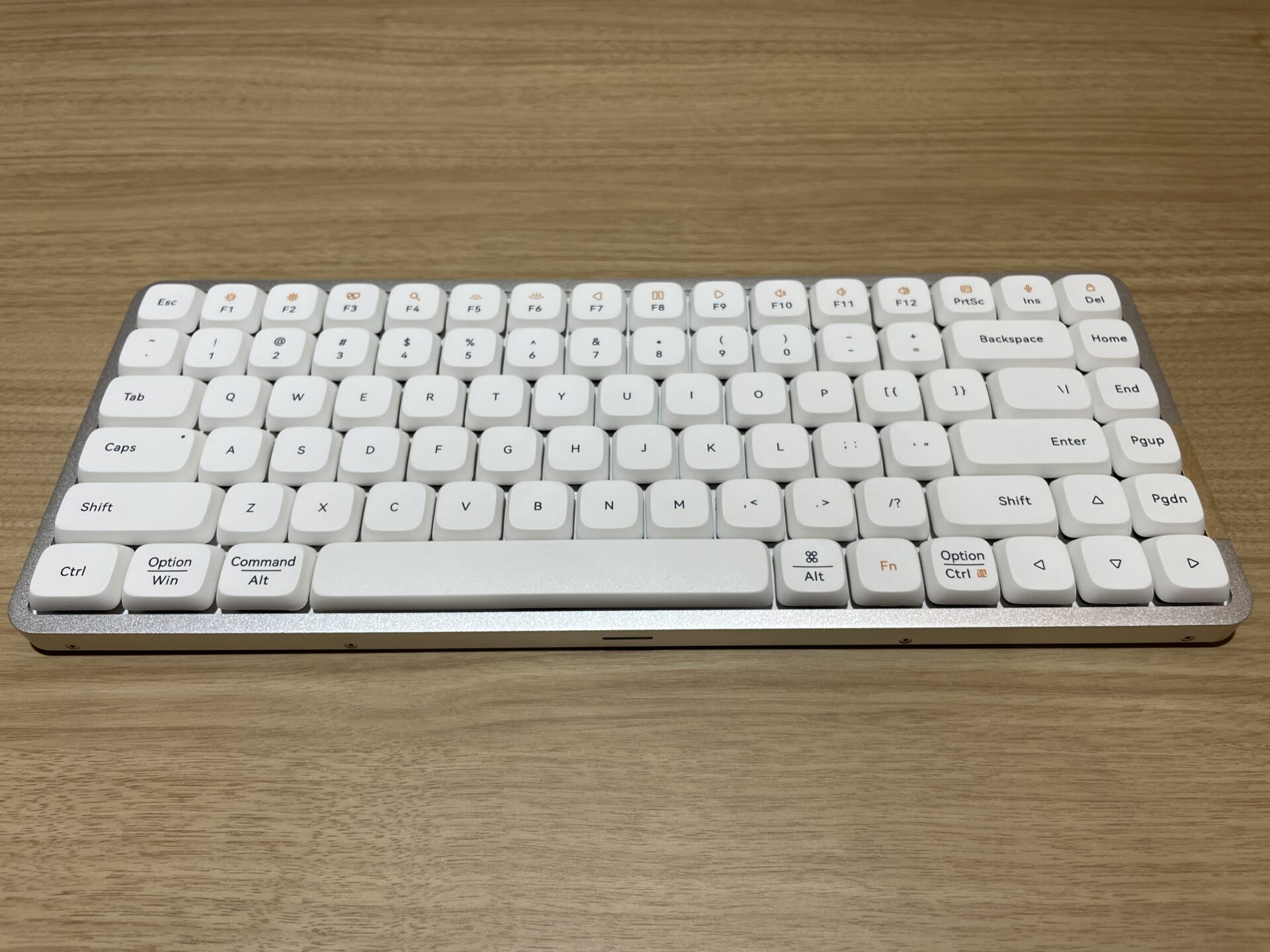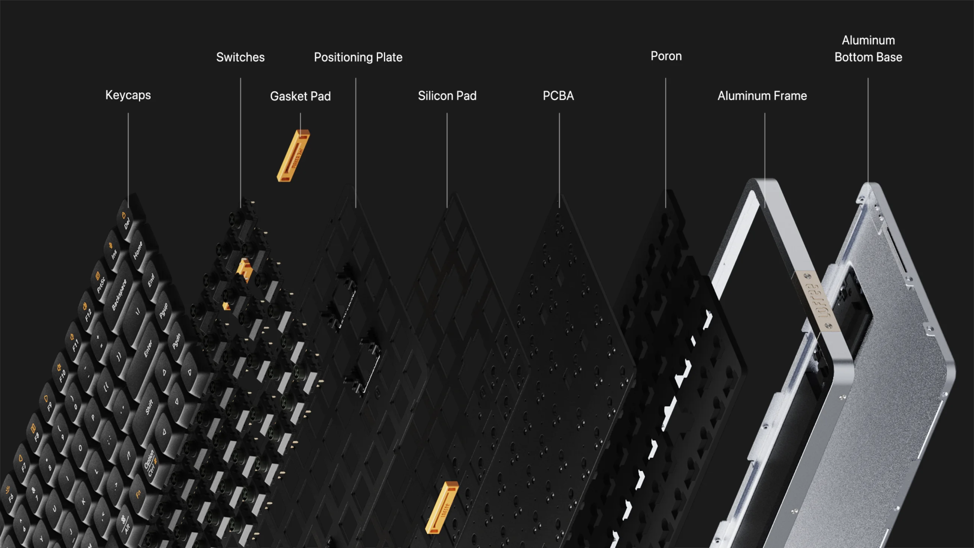 一般的なメカニカルキーボードの構造は、上からキーキャップ→キースイッチ→スイッチの位置を決めるプレート→心臓部である電子基盤(PCB)→メタルケースというのが普通だ。