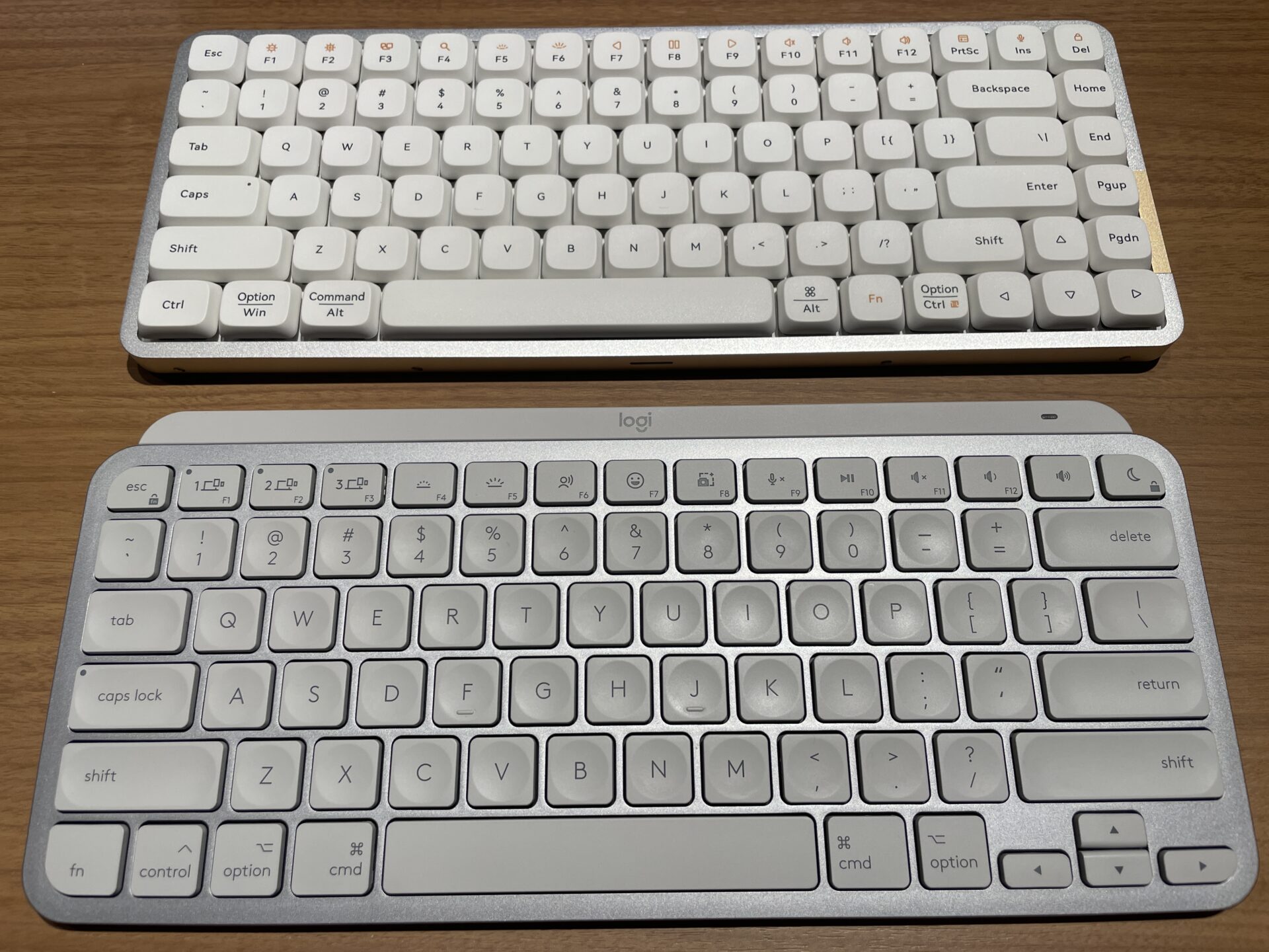 以下は、Lofree FLOW(上)とパンタグラフ式で薄型のMX Keys Mini(下)を並べてみた写真である。