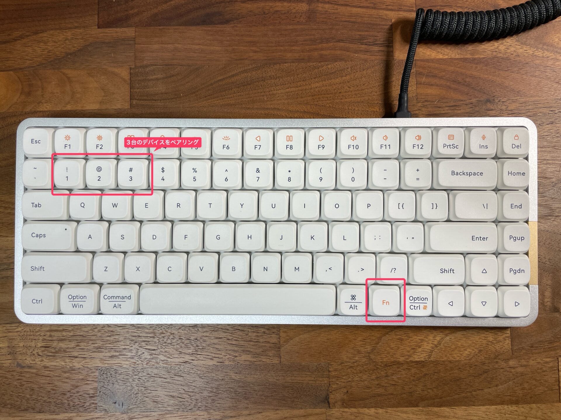 デバイスの切り替えも非常にスムーズで、キーボード右下の「Fn」キーと、数字の1,2,3キーを同時に押すことで、3つのデバイスとのペアリングや、ペアリング済みのデバイスの接続切り替えができる。