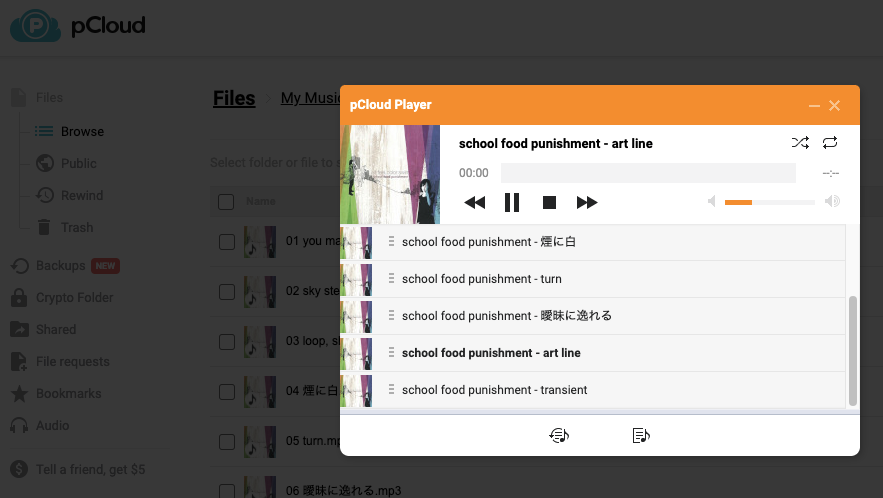 ブラウザからpCloudにアクセスすると、直接音楽を再生したり、プレイリストを作成したりできる。